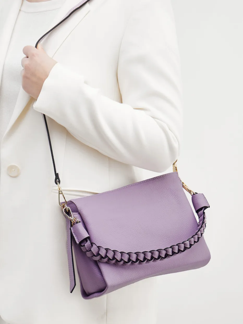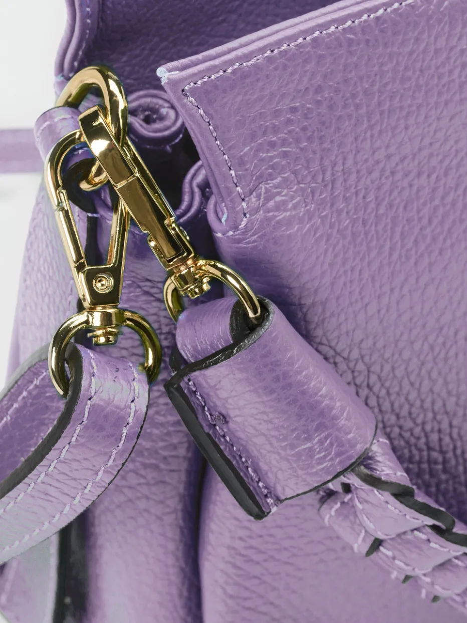 Die handgefertigte Schultertasche in zartem Fliederton vereint modernes Design mit funktionalen Details wie zwei Tragemöglichkeiten und goldfarbener Hardware.