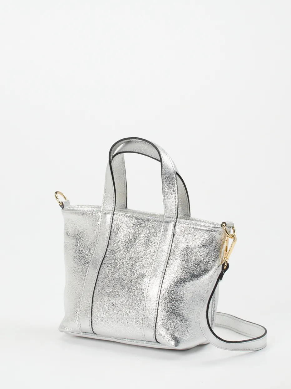 Diese kompakte Metallic-Tasche verbindet minimalistisches Design mit expressiven Details und bietet flexible Styling-Optionen für trendbewusste Looks.