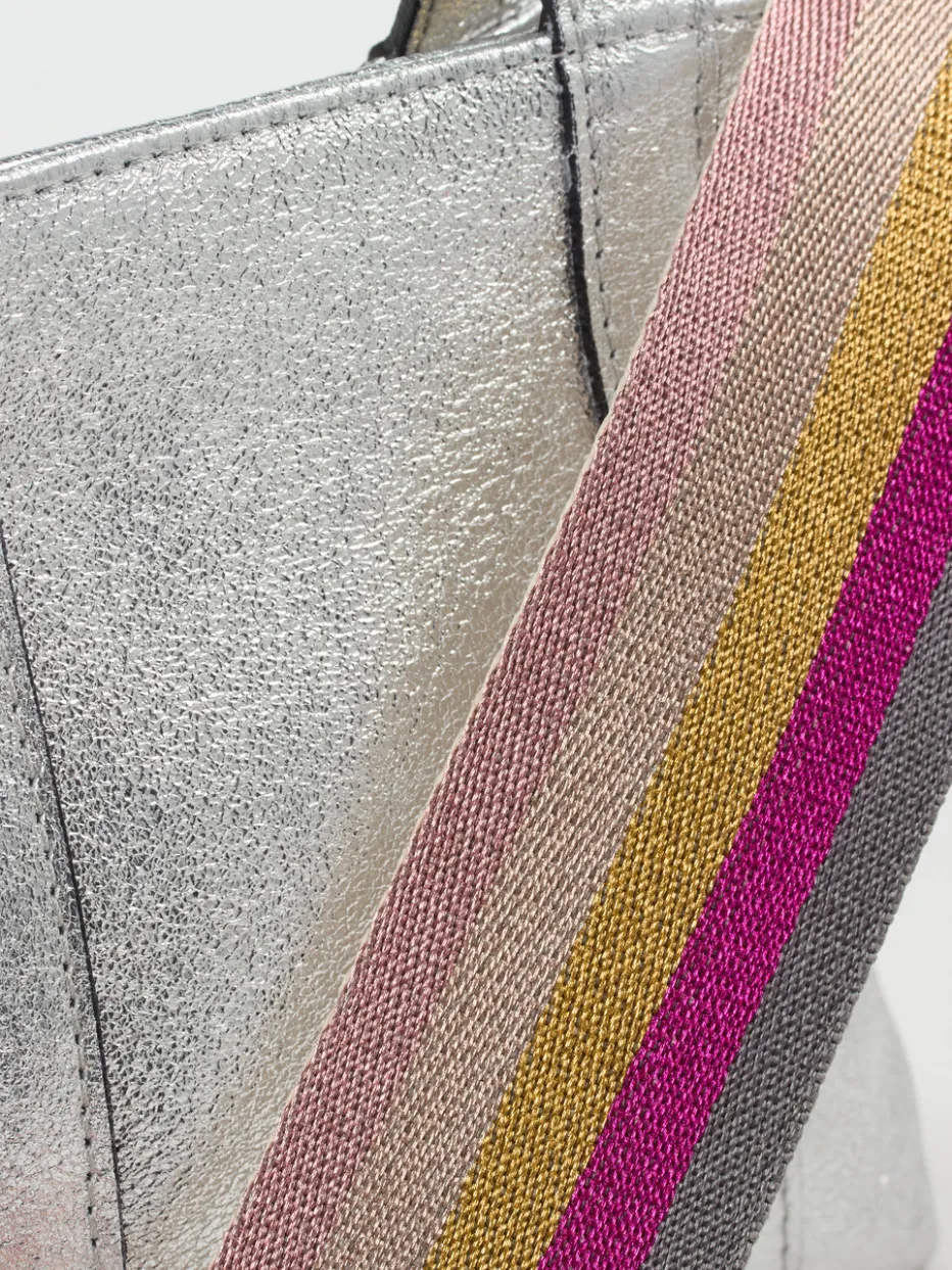 Ein Multitalent für jede Gelegenheit ist diese Umhängetasche von Marlon Firenze! Das Obermaterial aus Metallicleder besticht mit seinem attraktiven Glanz. Die Farbgebung in Silber und die schlichte Silhouette ohne überflüssigen Schmuck bieten nahezu unbegrenzte Kombinationsmöglichkeiten. Ein goldfarbener Reißverschluss ermöglicht ein einfaches Öffnen und Schließen der Tasche. Der geräumige Innenraum verfügt über ein Reißverschlussfach. Zwei Schulterriemen können nach Bedarf ausgetauscht werden und verändern so den Look der Tasche. Zur Wahl stehen ein eleganter, toniger Riemen sowie ein breiter, auffälliger Riemen in Rosa, Gold und Grautönen. Ein Accessoire, das zu begeistern weiß! – Obermaterial: Metallicleder – Futter: Textil – Farbe: Silber < – Größe: ca. 17 x 23 x 9 cm (H x B x T) – breiter Schulterriemen: verstellbar, maximal ca. 115 cm – zweiter Schulterriemen in Silber: verstellbar, max. ca. 100 cm – Verschluss: Reißverschluss
