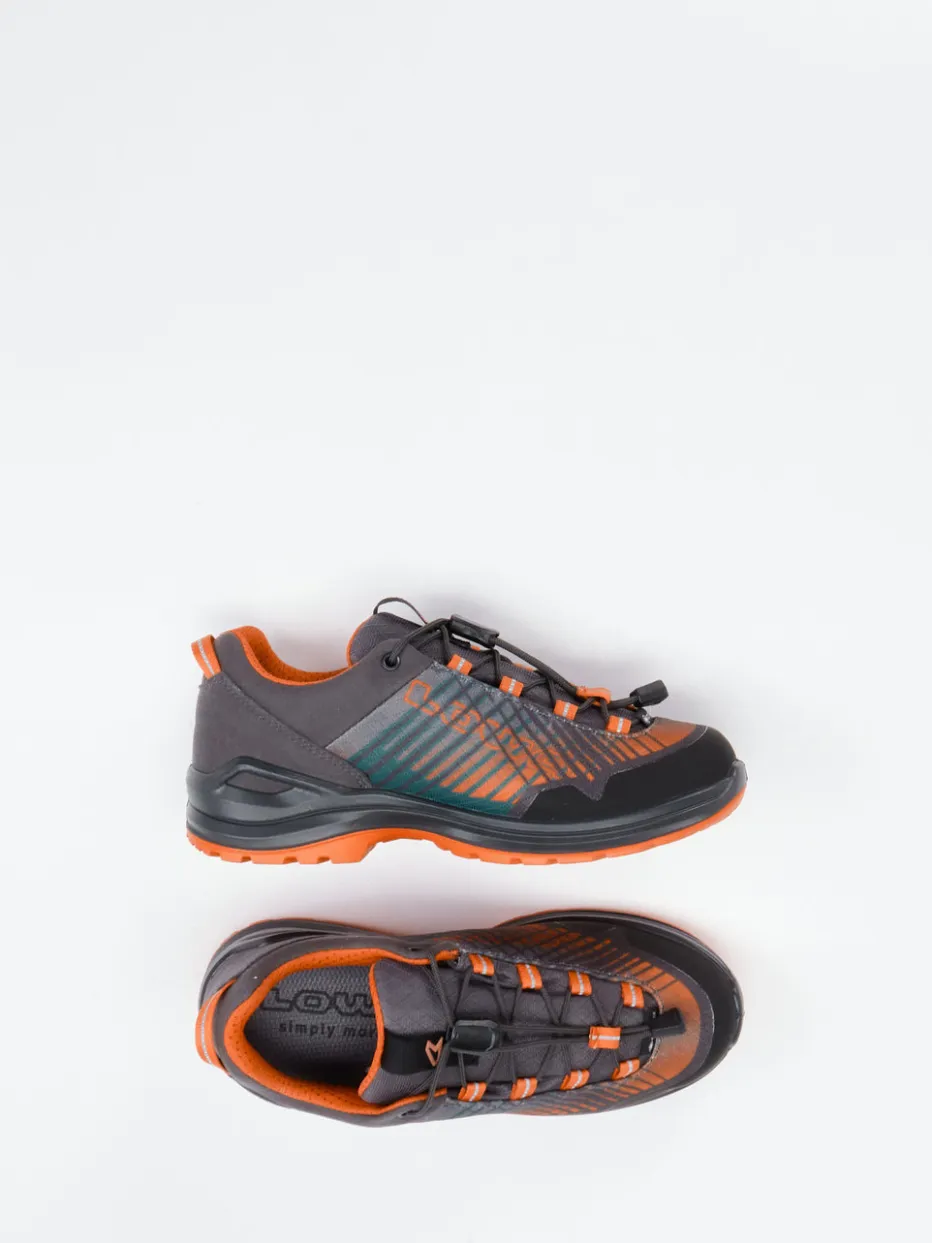 Komfort trifft Funktionalität im Gelände.Lowa bietet mit diesem Low-Cut-Wanderschuh ein dynamisches Unisex-Modell für Freizeit und Outdoor-Aktivitäten. Ideal für abwechslungsreiche Wanderungen im Frühling und Sommer: Das atmungsaktive Textil-Obermaterial ist matt ausgeführt und wird durch Mesheinsätze ergänzt, die für Belüftung sorgen. Farblich dominiert stilvolles Anthrazit, akzentuiert von Signalfarben in Orange und Petrol – perfekt abgestimmt mit kontrastiven Ösen und Innenfutter. Das Schnellschnürsystem erleichtert das Anziehen, während eine robuste Gummisohle mit ausgeprägtem Profil sicheren Halt bietet. Der Look orientiert sich an Gorpcore-Ästhetik und aktuellen Utility-Trends. Funktionaler Outdoor-Wert mit bewegungsfreundlichem Komfort – typisch Lowa.