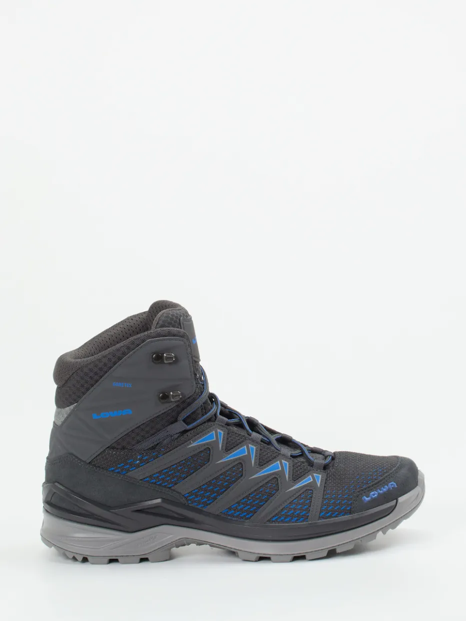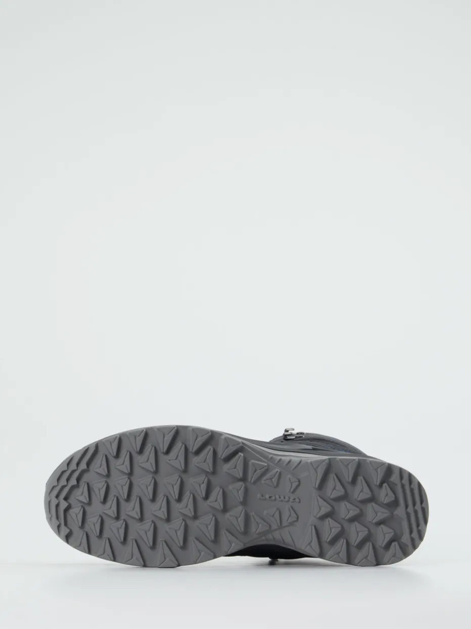 Outdoor-Komfort trifft auf Techwear-Design.Lowa präsentiert diesen knöchelhohen Wanderschuh für Outdoor-Enthusiasten. Für ausgedehnte Trekkingtouren bei wechselhaften Bedingungen bietet das Modell atmungsaktives Textil in Mesh-Struktur sowie eine wasserdichte GORE-TEX-Membran. Optisch dominieren Anthrazit und Kobaltblau, ergänzt durch markante Zickzack-Overlays und reflektierende Elemente. Der gepolsterte Schaft, die zweifarbigen Schnürsenkel mit Hakenösen und die griffige Gummiprofilsohle sorgen für Tragekomfort und Stabilität in jedem Gelände. Trendbewusst zeigt sich der Schuh im Gorpcore-Stil mit Techwear-Anleihen. Lowa steht für langlebige Funktionalität mit präzisem Outdoor-Fokus.