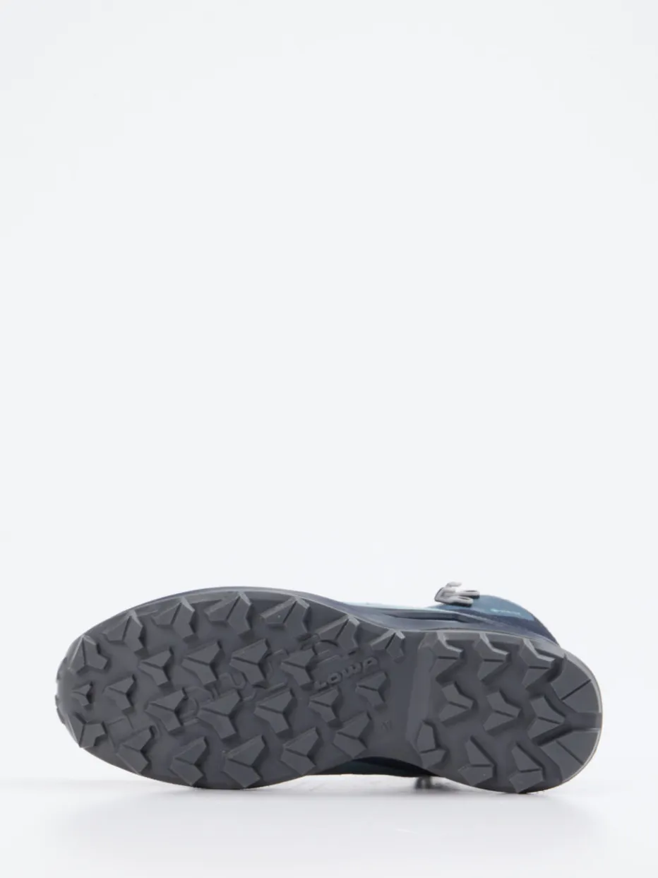 Ob beim Spielen im Freien oder bei Wanderungen – der Schuh überzeugt durch strapazierfähiges Veloursleder mit atmungsaktivem Mesh in Dunkel- und Aquablautönen. Die knöchelhohe Silhouette, gepolsterte Fersenkappe und reflektierende Details bieten Komfort und Sicherheit. Dank GORE-TEX® ist er wind- und wasserdicht sowie ideal für wechselhaftes Wetter geeignet. Die Schnürung mit Metallhaken sorgt für zuverlässigen Halt, die griffige Gummisohle garantiert Trittsicherheit auf unebenem Terrain. Der progressive Techwear-Look macht ihn zum Trendstück im Utility-Stil.