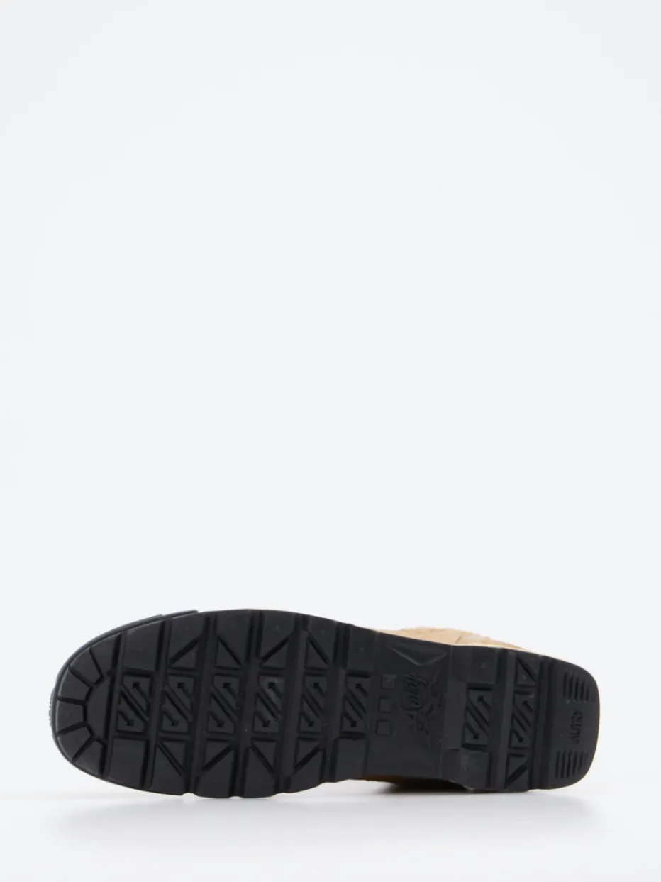 Ob auf ausgedehnten Spaziergängen oder beim urbanen Abenteuer – der Boot aus Veloursleder mit charakteristisch genarbter Oberfläche vereint Komfort mit optischer Prägnanz. Sein sandbeiger Grundton wird durch schwarze und beige Akzente ergänzt. Die knöchelhohe Form, gepolsterter Schaft und eine markant profilierte Gummisohle sorgen für Halt. Details wie die zweifarbige Schnürung und das Labelpatch betonen den 90s-inspirierten Look. Ideal für Utility-Outfits mit Outdoorjacke oder Heritage-Rucksack.