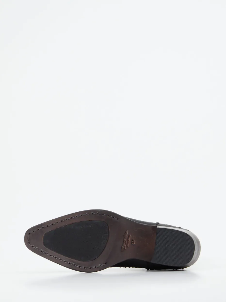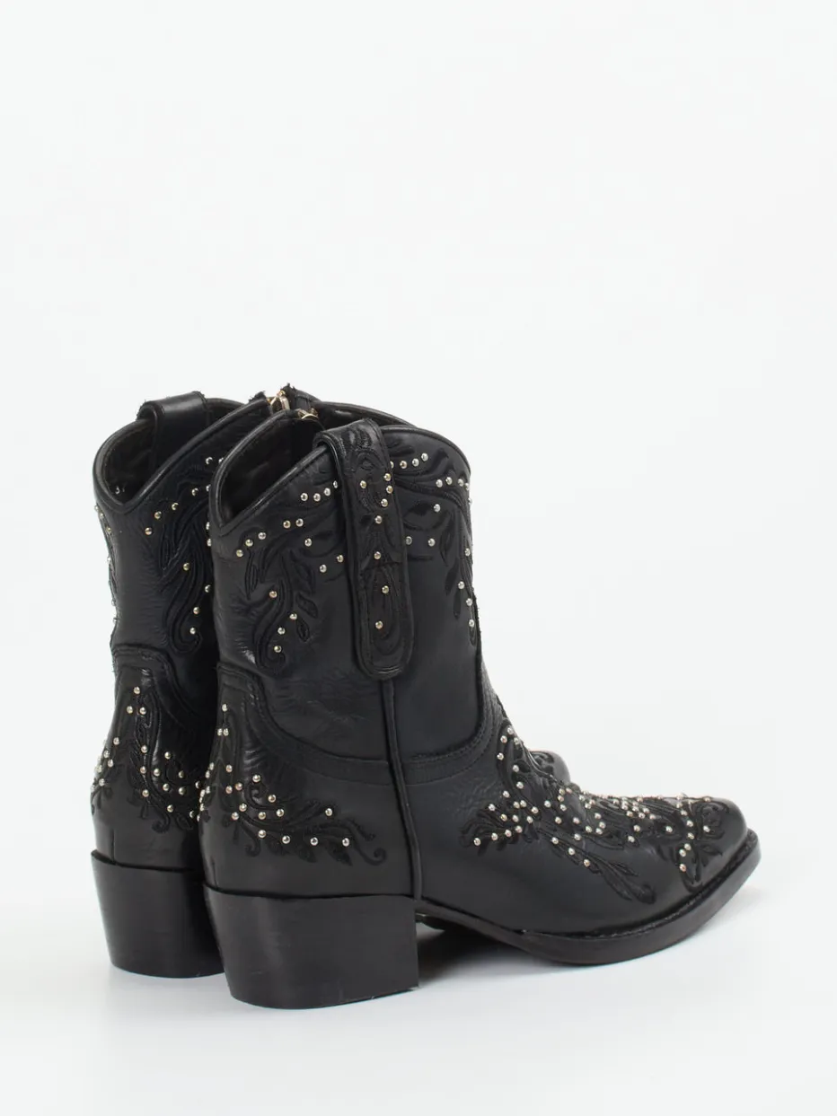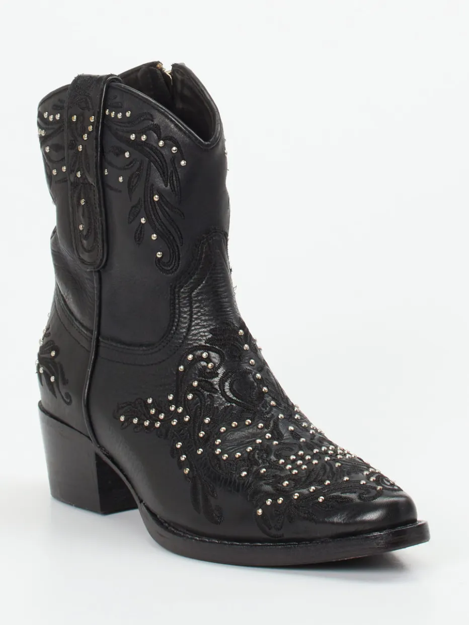 Western trifft Detailverliebtheit.Rebecca White interpretiert die klassische Damen-Stiefelette im Cowgirl-Style neu. Markante Alltagssituationen verlangen nach robustem Stil mit Persönlichkeit – genau das bietet diese schwarze Western-Stiefelette aus hochwertigem, genarbtem Lammleder mit floraler Prägung. Silberfarbene Nieten, Ton-in-Ton-Stickereien und die spitz zulaufende Leistenform prägen den auffälligen Look. Funktionelle Details wie der seitliche Reißverschluss, Zuglaschen und ein bequemer 4 cm-Trichterabsatz in Kombination mit einem weichen Lederfutter sorgen für Komfort. Ideal für Cowgirl-Core-Styles, Festivals oder urbane Streetwear. Ein Design mit Profil und markentypischer Raffinesse – dekorativ bis ins Detail.
