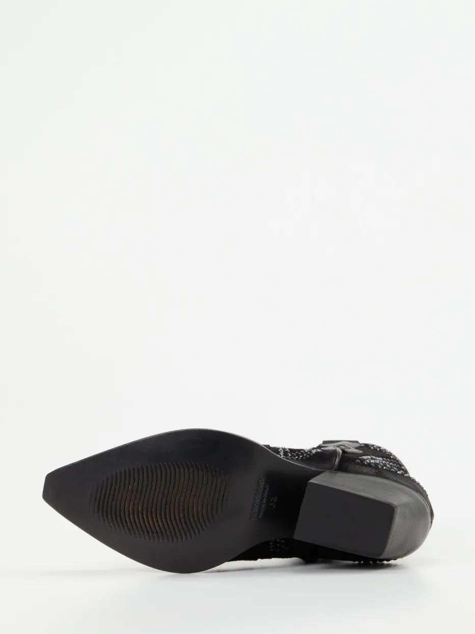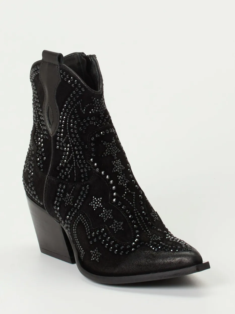 Western-Glam für ausdrucksstarke Looks.Konstantin Starke präsentiert eine stilprägende Stiefelette im Western-Stil. Für Partynächte ebenso wie für modische Street-Styles bietet dieses Modell ein elegantes Statement: Gefertigt aus schwarzem Veloursleder mit dezenter Used-Optik, zeigen die spitz zulaufenden Boots eine knöchelhohe Silhouette mit strukturierter Nietenverzierung. Die matten, tonalen Schmucksteine formen florale und sternförmige Muster – ein Blickfang mit Glam-Charakter. Dank Reißverschluss und Ziegenlederfutter ist angenehmer Komfort gewährleistet. Der lederbezogene Trichterabsatz rundet den femininen Auftritt ab. Idealer Kombipartner für schmale Jeans oder Fransenjacken. Stilbetonter Schuh mit markentypischer Designhandschrift und exzellenter Verarbeitung.