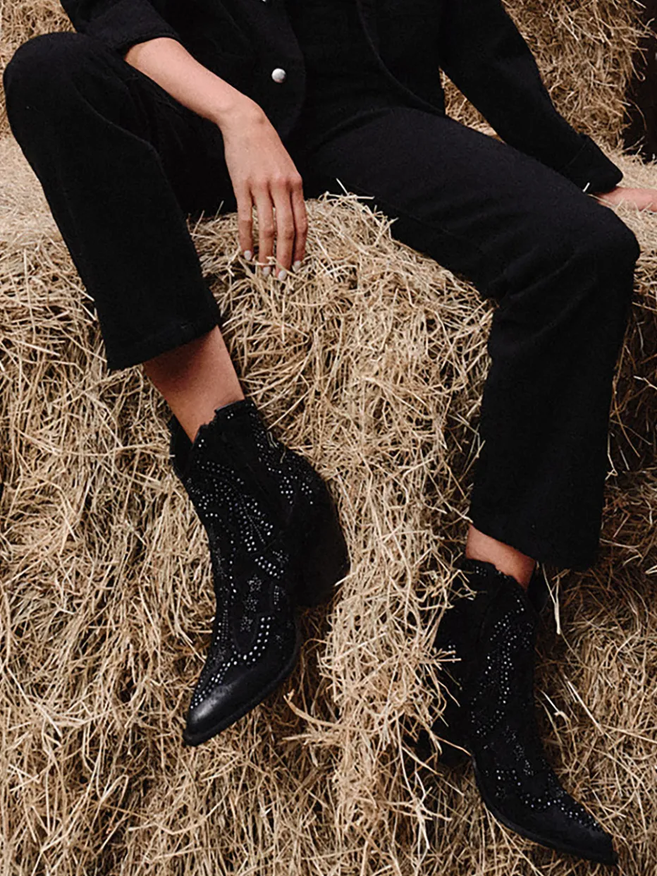 Die Western-Stiefelette von Konstantin Starke kombiniert mattes Veloursleder mit verzierten Schmucknieten zu einem detailreichen Glamour-Look.