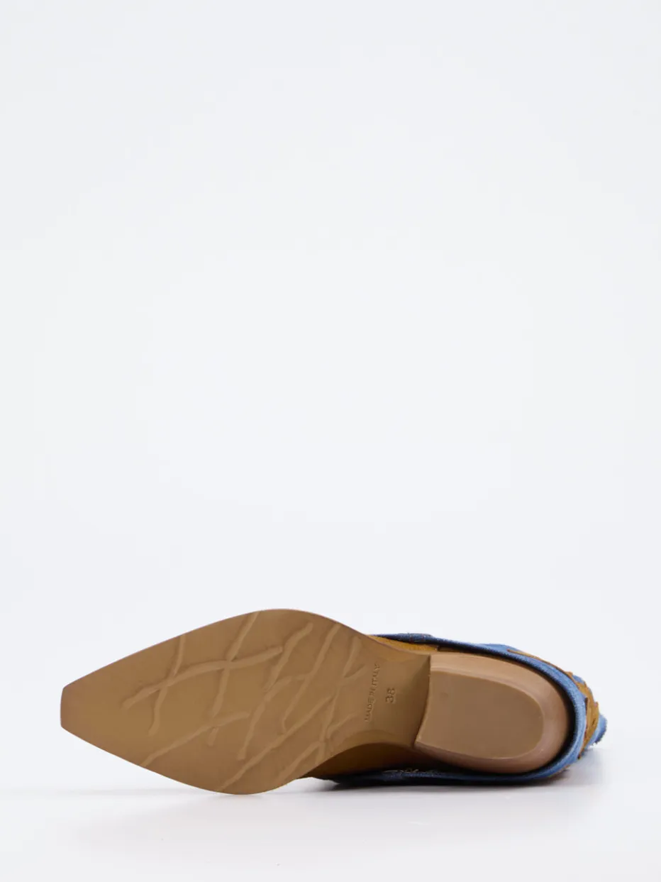 Konstantin Starke interpretiert klassische Westernstiefel für Damen neu: mit echtem Veloursleder und textiler Jeansoptik.