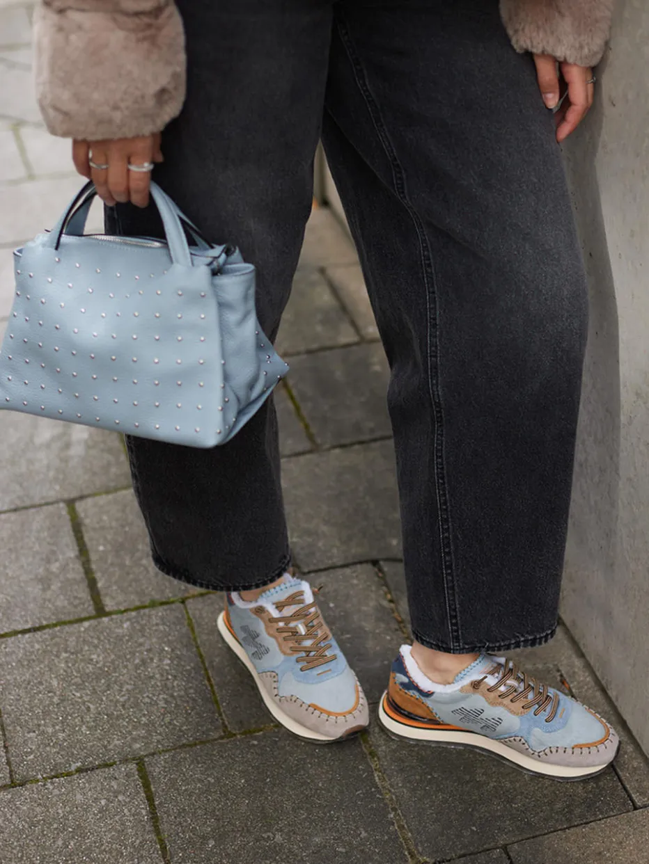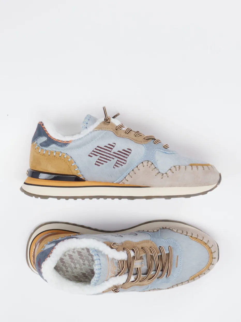 Wärmender Komfort trifft Retro-Charme.MRP zeigt mit diesem damenspezifischen Winter-Sneaker ein stilvolles Modell für die kalte Jahreszeit. Ideal für entspannte Alltagsmomente an kühlen Tagen: Der Sneaker aus Textil überzeugt durch samtig gebürstete Veloursleder-Details, gefüttert mit weichem Kunstfell für angenehme Wärme. Das Design in Pastellblau mit beigen und braunen Farbflächen greift die Retro-Runner-Silhouette auf und wird durch prägnante Kontrastnähte und eine gestickte Logo-Applikation akzentuiert. Zweifarbige Schnürsenkel und eine durchscheinende Gummisohle mit Outdoor-Profil ergänzen die sportlich-casual Optik. Teil aktueller Cozy-Outdoor- und Craftcore-Trends, passt das Modell hervorragend zu Strick & Parka. Der MRP-Look bietet funktionales Design für stilbewusste Wintertage.