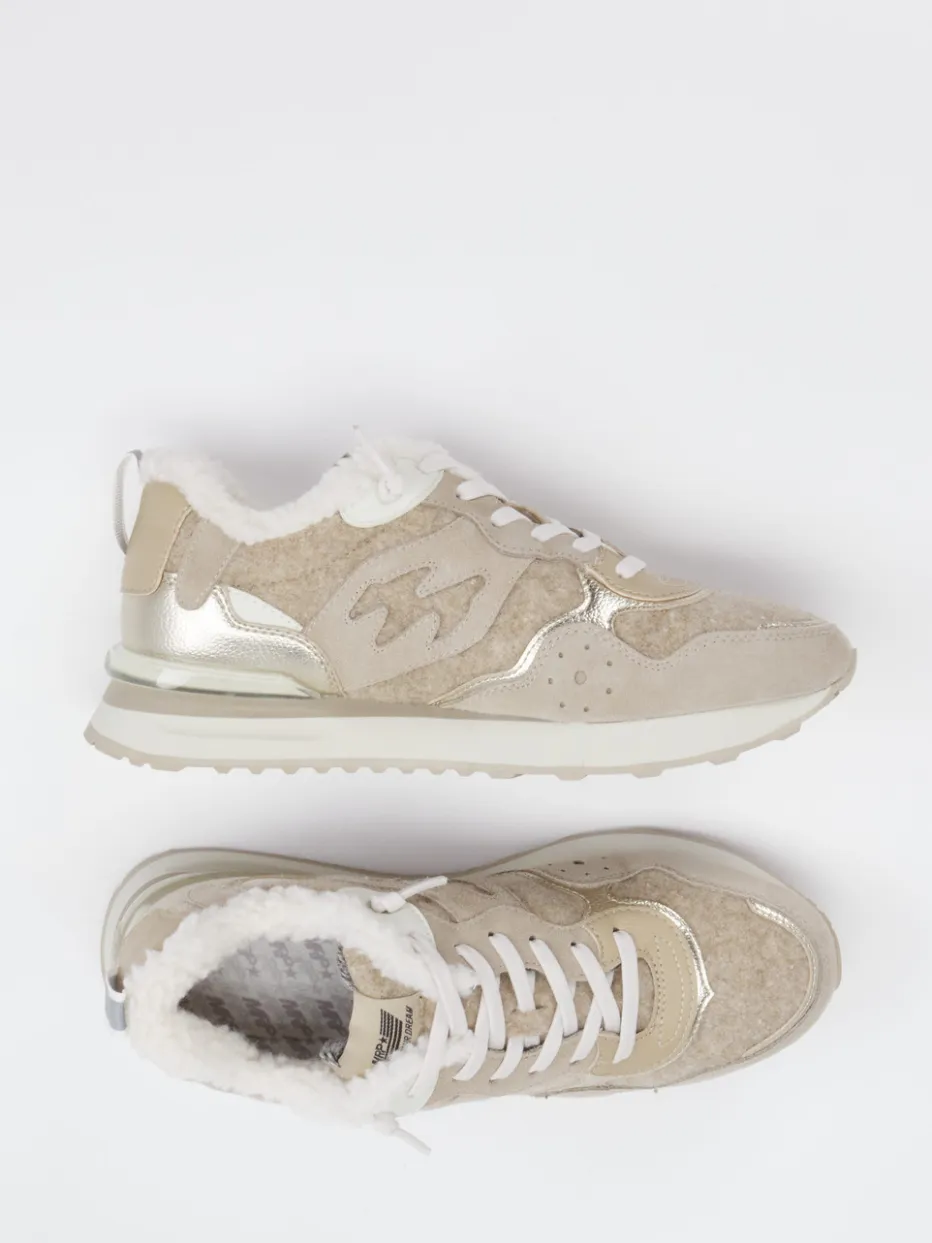 Ideal für entspannte Spaziergänge und winterliche Alltagslooks: Das Modell kombiniert Textil mit samtigem Veloursleder und kontrastiert matt strukturierte Flächen mit glänzenden Metallic-Elementen in Gold. Der beige Grundton mit Offwhite-Akzenten verleiht dem Schuh einen ruhigen, saisonalen Look. Ein kuscheliges Innenfutter aus Kunstfell spendet wohlige Wärme, während die profilierte Gummisohle sicheren Tritt bei winterlichen Bedingungen bietet. Die klassische Schnürung sorgt für Stabilität und Komfort.