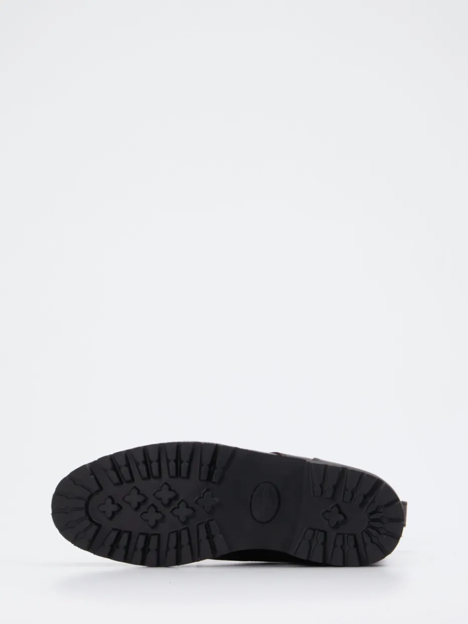 Ideal für urbane Streifzüge bei winterlichen Bedingungen: Die Boots bestehen aus fein verarbeitetem Kalbleder mit samtig angeschliffenen Velours-Partien und präsentieren sich in einem dunklen Braunton mit matter Oberfläche. Eine tonale Schnürung mit Metallösen, klassische Silhouette und markante Zuglasche unterstreichen den Utility-Look. Im Inneren sorgt warmes Lammfellfutter für angenehmen Tragekomfort. Die griffige Gummisohle verleiht Trittsicherheit auf nassem oder gefrorenem Untergrund. Passt hervorragend zu gefütterten Jacken und dunklen Denim-Looks.