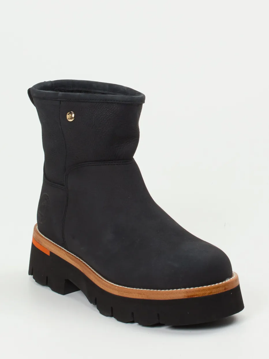 Wärmend durch den Winter.Panama Jack präsentiert eine Damen-Stiefelette in klassischer Winterboot-Optik. Für Spaziergänge bei Frost oder den urbanen Alltag bietet das schwarze Nubukleder, samtig genarbt, zuverlässigen Schutz. Das warme Innenfutter aus Textil sorgt für angenehme Isolation. Die schlupffreundliche, gerade Form mit betonter Schaftöffnung erleichtert das Anziehen. Optisch setzen goldfarbene Metallniete und eine mittelbraune Kontrastsohle mit orangerotem Akzent dezente Highlights. Die rutschfeste Profilsohle verleiht sicheren Halt auf winterlichem Untergrund. Inspiriert von Workwear trifft Funktionalität auf minimalistischen Stil. Ein verlässlicher Begleiter mit bodenständigem Charakter und stilbewusstem Look.