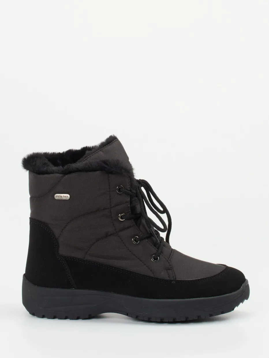 Warmes Design trifft zuverlässige Funktion.Lackner präsentiert mit dieser Winter-Stiefelette eine funktionale Outdoor-Lösung für Damen. Wenn vereiste Wege nach sicherem Halt verlangen, bietet das wind- und wasserdichte Nylon-Material zuverlässigen Schutz – ergänzt durch eine matt strukturierte Oberfläche und isolierendes Kunstfellfutter in Lammfelloptik. Die schwarze Farbgebung, die klassische hochschaftige Form und tonige Schnürung samt Metallösen sorgen für einen markanten Utility-Look. Highlight ist die griffige Gummiprofilsohle mit einklappbaren Spikes. Das sichtbare „raintex“-Label steht für wetterfeste Expertise. Ideal für urbane Wintertage und längere Spaziergänge – mit alltagstauglichem Komfort auf Damenleisten.