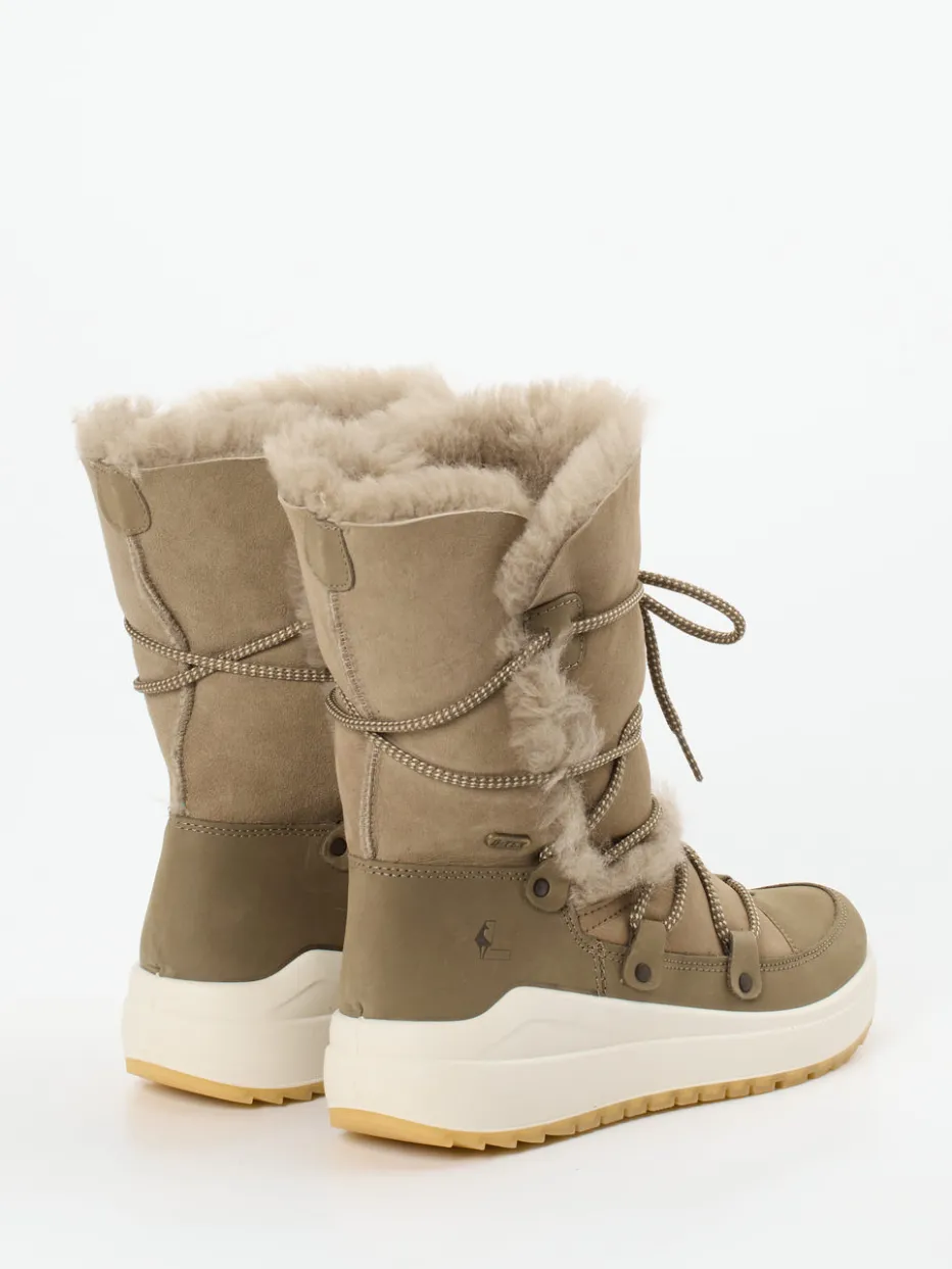 Für urbanes Winterwetter gemacht.Die Marke Lackner präsentiert mit diesen Winterboots ein funktionales Damenmodell für Alltag und Outdoor. Wenn Wind, Kälte und unebene Wege das Tagesprogramm bestimmen, bietet dieser mid-calf-Stiefel aus wind- und wasserdichtem Veloursleder samtig-matter Textur zuverlässigen Schutz. Sein sandiger Braunton, sichtbares Kunstfellfutter und die strukturierte Kontrastsohle unterstreichen die Scandi-inspirierte Optik. Details wie die zweifarbige Schnürung und das griffige Sohlenprofil sprechen für einen robusten Einsatz bei Spaziergängen oder Stadtbummeln. Stilistisch reiht sich das Modell stimmig in den Gorpcore-Trend ein und harmoniert ideal mit Thermo-Leggings oder Parka. Ein wetterbeständiger Komfortboot mit modischer Funktionalität von Lackner.