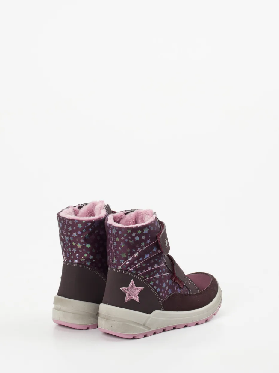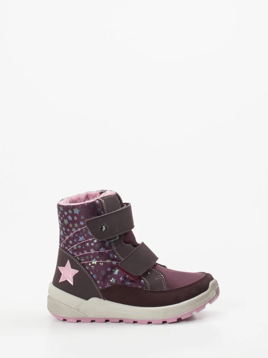 Funktional und stilvoll durch kalte Tage.Ricosta bringt mit diesem Winterstiefel für Kinder ein Modell, das Komfort und Sichtbarkeit bei jedem Wetter vereint. Ideal für Schule, Freizeit oder Feldweg: Das robuste Obermaterial aus Synthetik trifft hier auf eine matt strukturierte Oberfläche mit reflektierenden, rosa Sternmotiven. Die hoch geschnittene Silhouette mit doppeltem Klettverschluss und warm gefüttertem Innenleben sorgt für stabilen Halt und wohlige Wärme. Die dicke PU-Sohle greift sicher auf rutschigem Untergrund. Das Design in Pflaume mit violetten und rosa Akzenten macht den Stiefel zu einem Blickfang – auch im Dämmerlicht. Markentypisch funktional mit kindgerechtem Komfort ausgestattet.