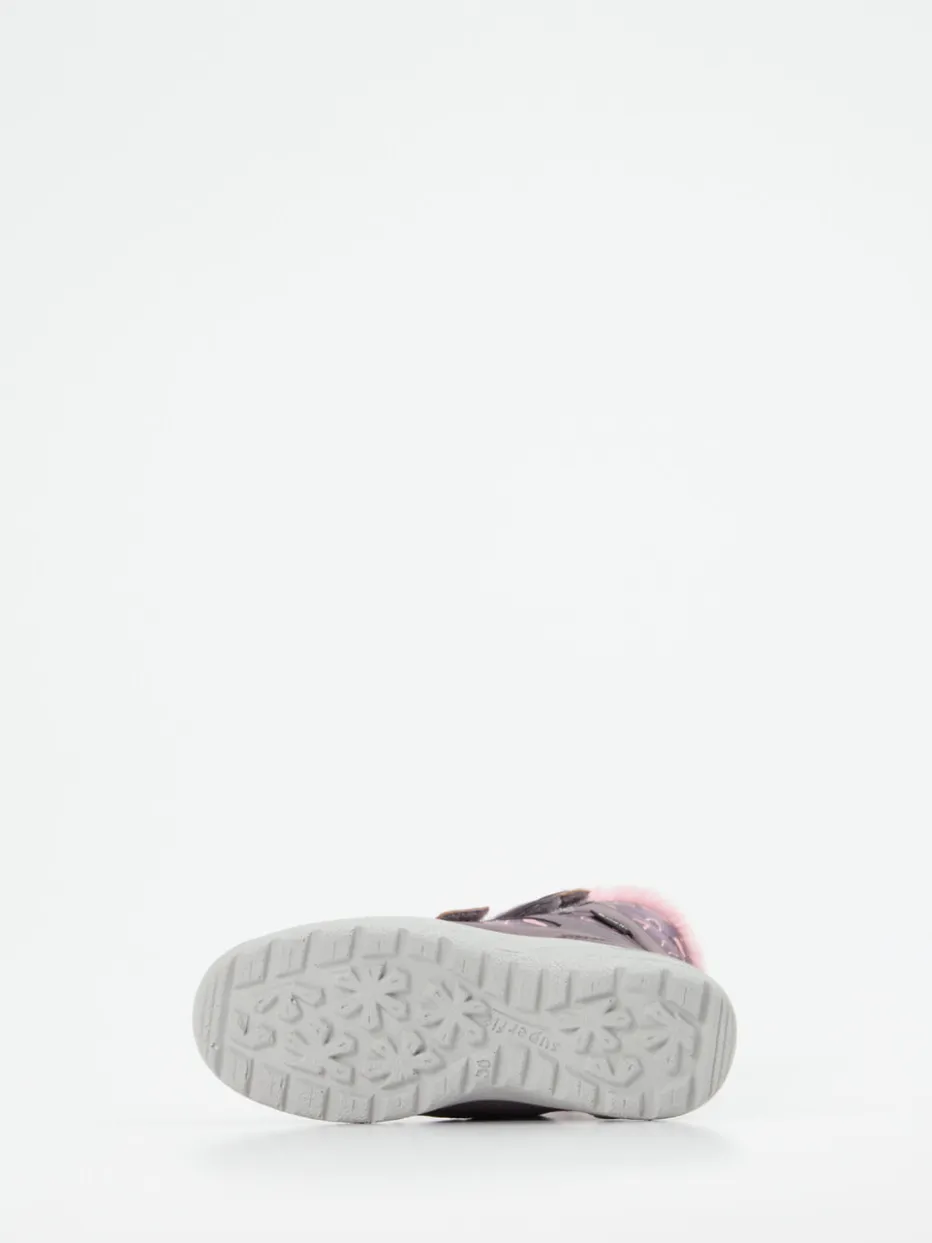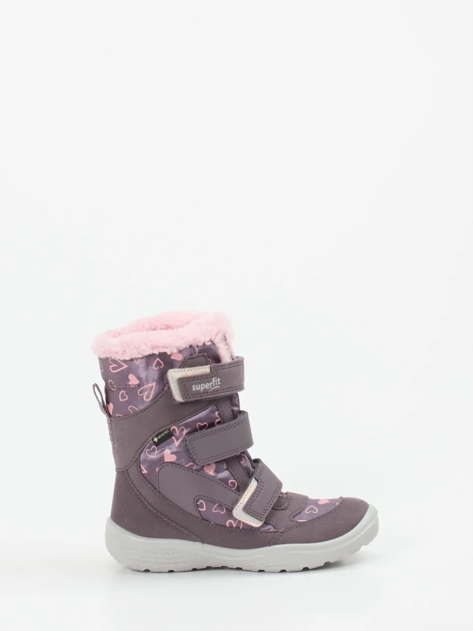 Herzmuster und Funktion vereint.Superfit präsentiert komfortable Winterstiefel für Kinder. Wenn es draußen kalt und nass wird, bieten diese knöchelhohen Stiefel mit reflektierenden Details sicheren Halt und Wärme beim Spielen oder Spazieren. Das synthetische Obermaterial erhält durch die matte Oberfläche und das auffällige Herzmuster in Pflaume und Rosa eine besonders charmante Optik. Drei praktische Klettverschlüsse ermöglichen ein einfaches An- und Ausziehen, während der flauschige Kunstfellkragen und das warme Textilfutter für angenehmen Tragekomfort sorgen. Die profilierte PU-Sohle bietet Trittsicherheit bei winterlichen Bedingungen. Perfekt zu Thermo-Leggings und Winterjacke. Superfit-typisch mit kindgerechtem Komfort und detailverliebtem Look.