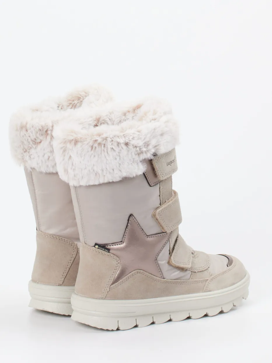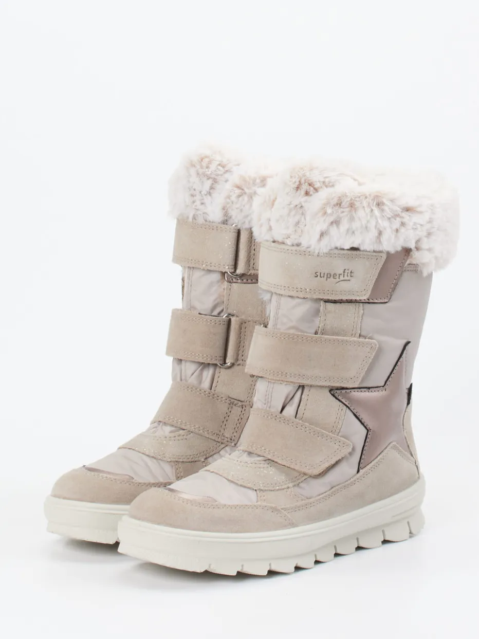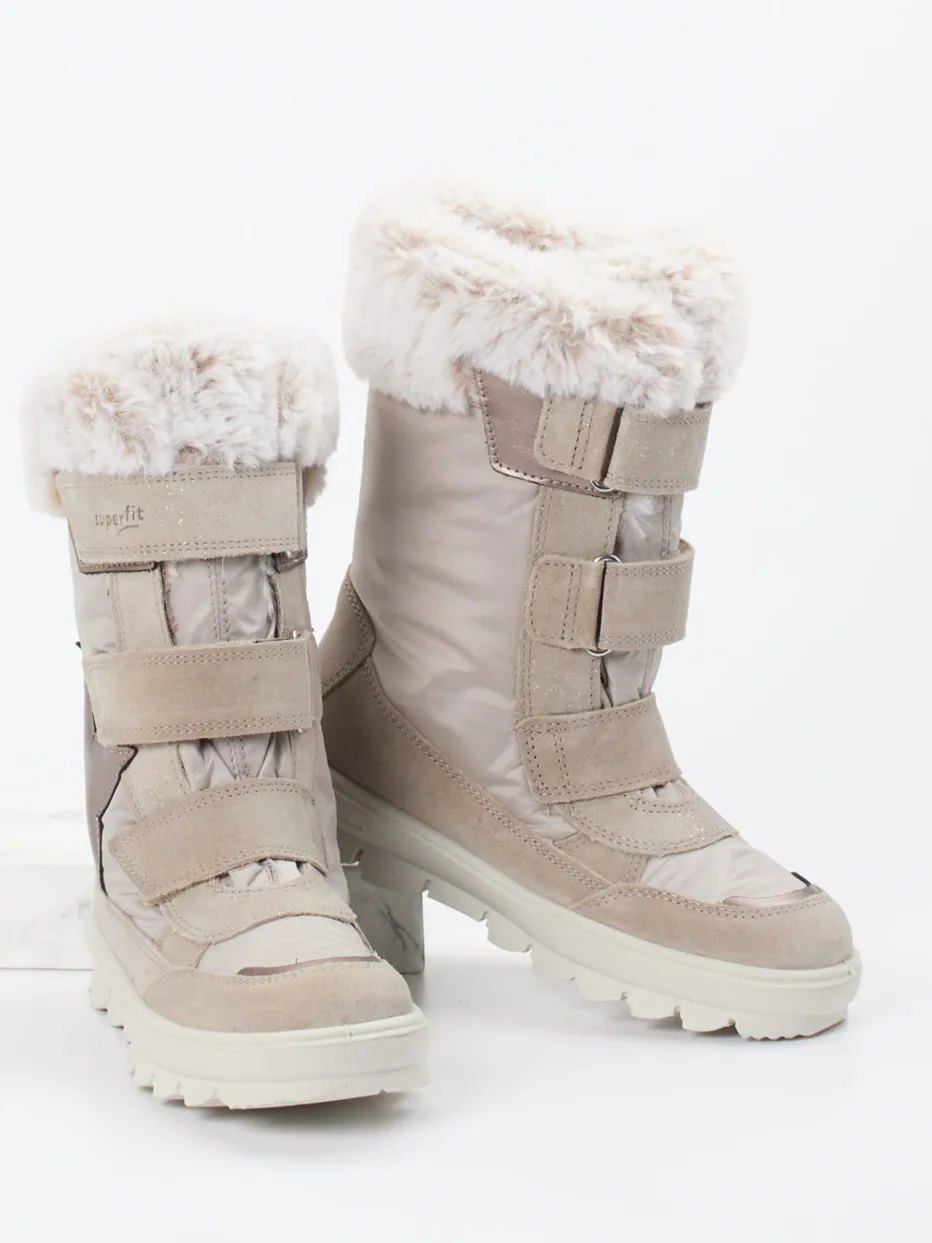 Wärme trifft Funktionalität.Der Winterstiefel von Superfit für Kinder vereint wärmenden Komfort mit robuster Alltagstauglichkeit. Ob draußen im Park oder auf dem Schulweg: Das Modell mit wasserabweisender GORE-TEX-Membran schützt zuverlässig vor Kälte und Nässe. Das beige Veloursleder zeigt eine matte Oberfläche mit samtiger Textur, ergänzt durch glänzende Details an einer Sternapplikation. Für kinderleichtes Anziehen sorgen drei breite Klettverschlüsse, während der flauschige Kunstfellkragen für ein angenehm weiches Tragegefühl sorgt. Die PU-Sohle mit Profil bietet sicheren Halt auch auf rutschigem Untergrund. Modisch orientiert sich der Stiefel an aktuellen Soft-Neutrals. Superfit bietet kompromisslose Wintertauglichkeit in kindgerecht stilvollem Design.