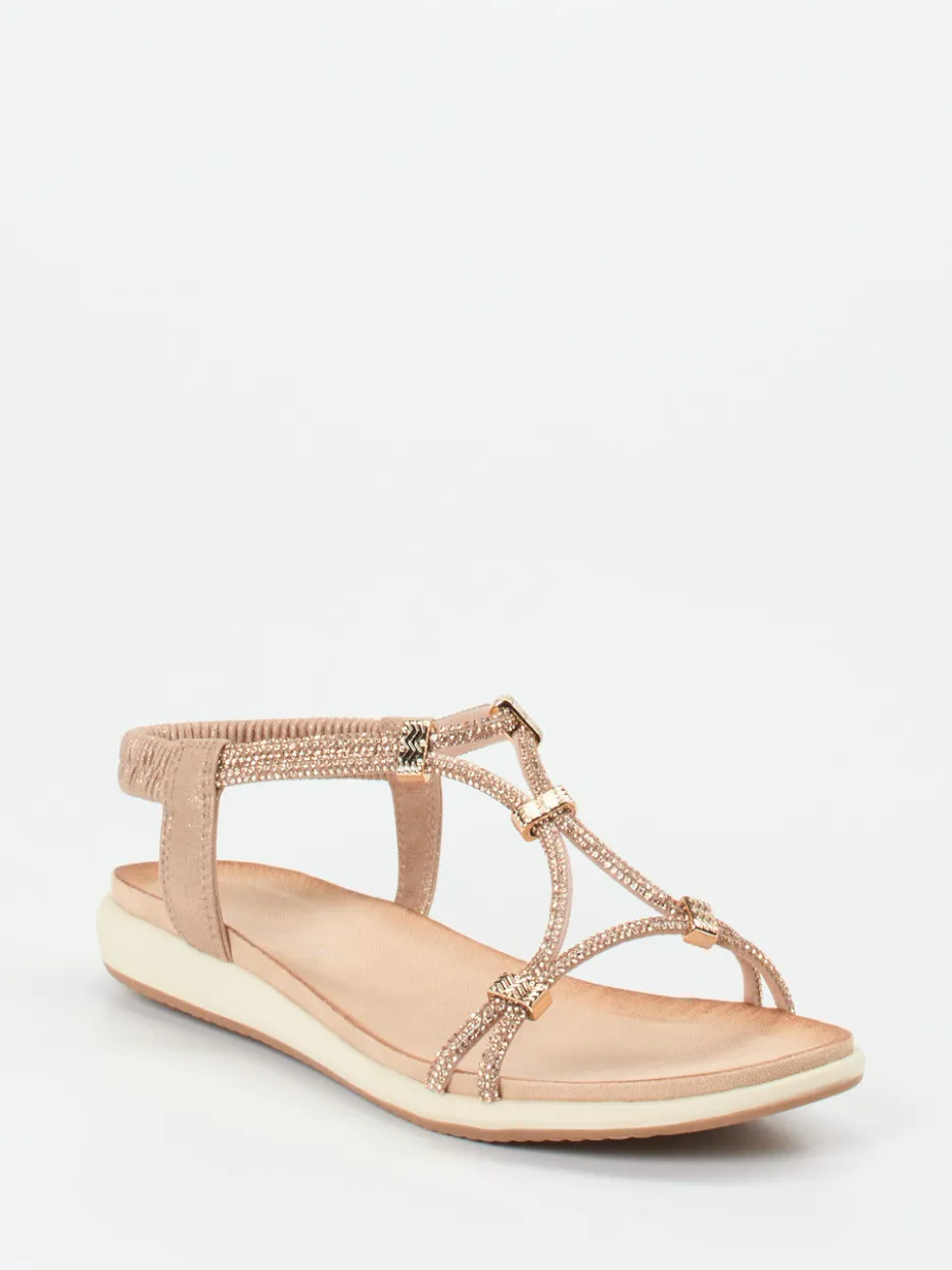 Glanzmomente für den Sommer.Die Marke Andrea Puccini präsentiert mit dieser Damen-Zehensteg-Sandale eine stilvolle Wahl für Alltag und Urlaub. Roséfarbenes Metallicleder mit tonigem Strassbesatz und goldfarbenen Akzenten sorgt für ein feminines Design mit Boho-Chic-Charme. Der elastische Fersenriemen ermöglicht einen komfortablen Einstieg ohne Verschluss. Eine weich gepolsterte Decksohle und die griffige Gummisohle steigern den Tragekomfort spürbar. Die flache, offene Silhouette ergänzt sommerliche Freizeit-Outfits ebenso wie leichte Kleider. Aktuelle Metallic-Trends und Komfortorientierung verbinden sich hier gelungen. Federleicht, glitzernd und bequem – eine elegante Sommerlösung im Signature-Stil von Andrea Puccini.