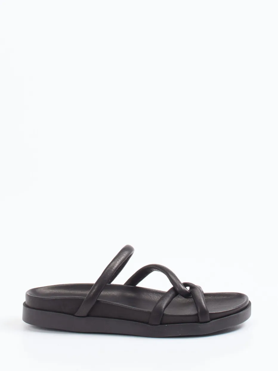Perfekt für Stadtspaziergänge oder entspannte Urlaubsmomente: Die Sandale präsentiert sich in tiefschwarzem Kalbleder mit matter Oberfläche und komfortabel gepolsterten Riemen. Die flache, leicht eckige Fußform betont das dezente Design, während die strukturierte Gummilaufsohle sicheren Halt verleiht. Die offene Schlupfform unterstreicht den unkomplizierten Charakter. Modisch greift sie den „Quiet Luxury“-Trend auf und passt ideal zu Looks mit Leinenhose oder Crossbody-Tasche.