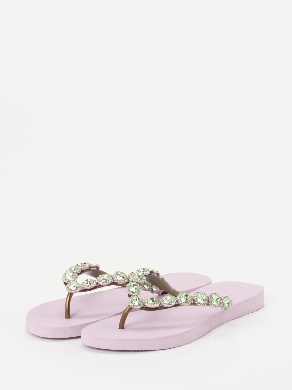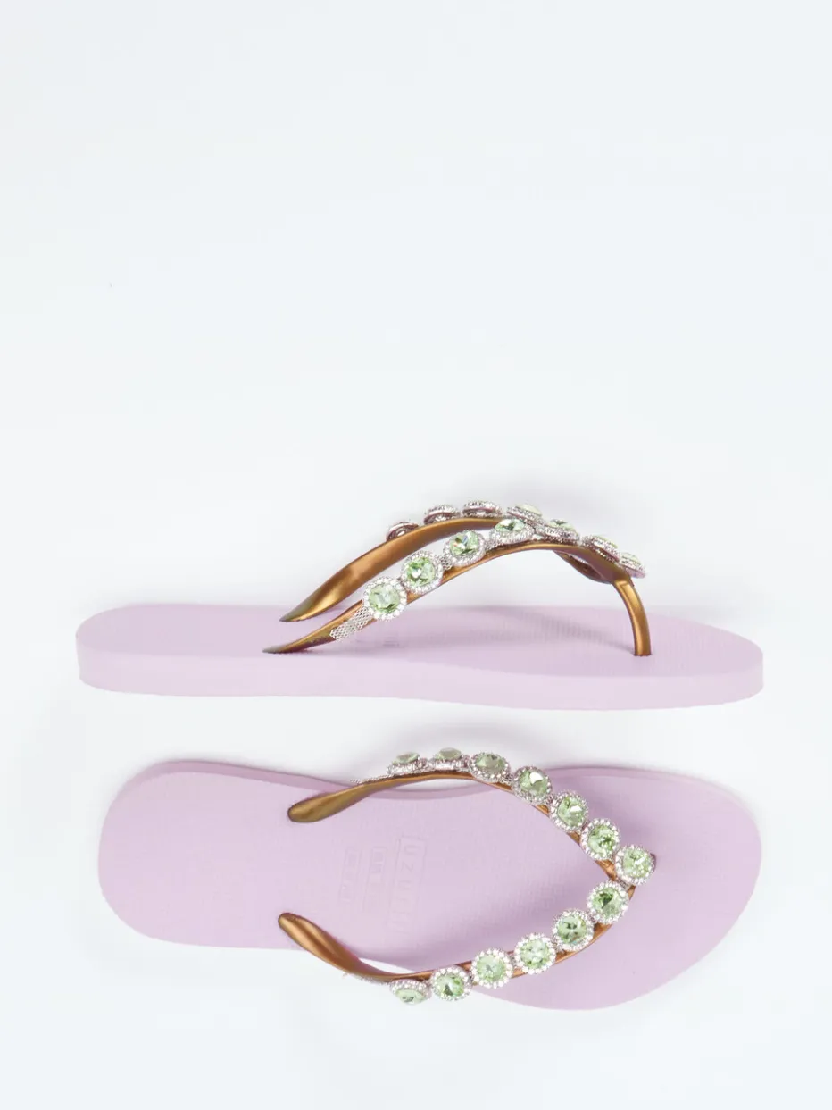 Glamour am Strand: Strass trifft Pastell.Uzurii präsentiert diese Damen-Zehentrenner im luxuriösen Sommerstil. Ideal für Beach-Clubs, Rooftop-Partys oder sonnige Promenadenwege bringen diese flachen Sandalen Fashion in den Alltag. Das leichte Gummi wird ergänzt durch metallisch schimmernde Riemen in Bronzegold, die von hellgrünen Schmuck- und Strasssteinen verziert sind. Die Pastellflieder-farbene Sohle setzt einen soften Kontrast, während die klassische Silhouette ohne Verschluss für ein schnelles Reinschlüpfen sorgt. Inspiriert vom Y2K-Trend und Resortwear für den Sommer 2024. Styling-Tipp: zu Kaftans oder Metallic-Accessoires. Modischer Komfort trifft Strand-Ästhetik im Signature-Design von Uzurii.