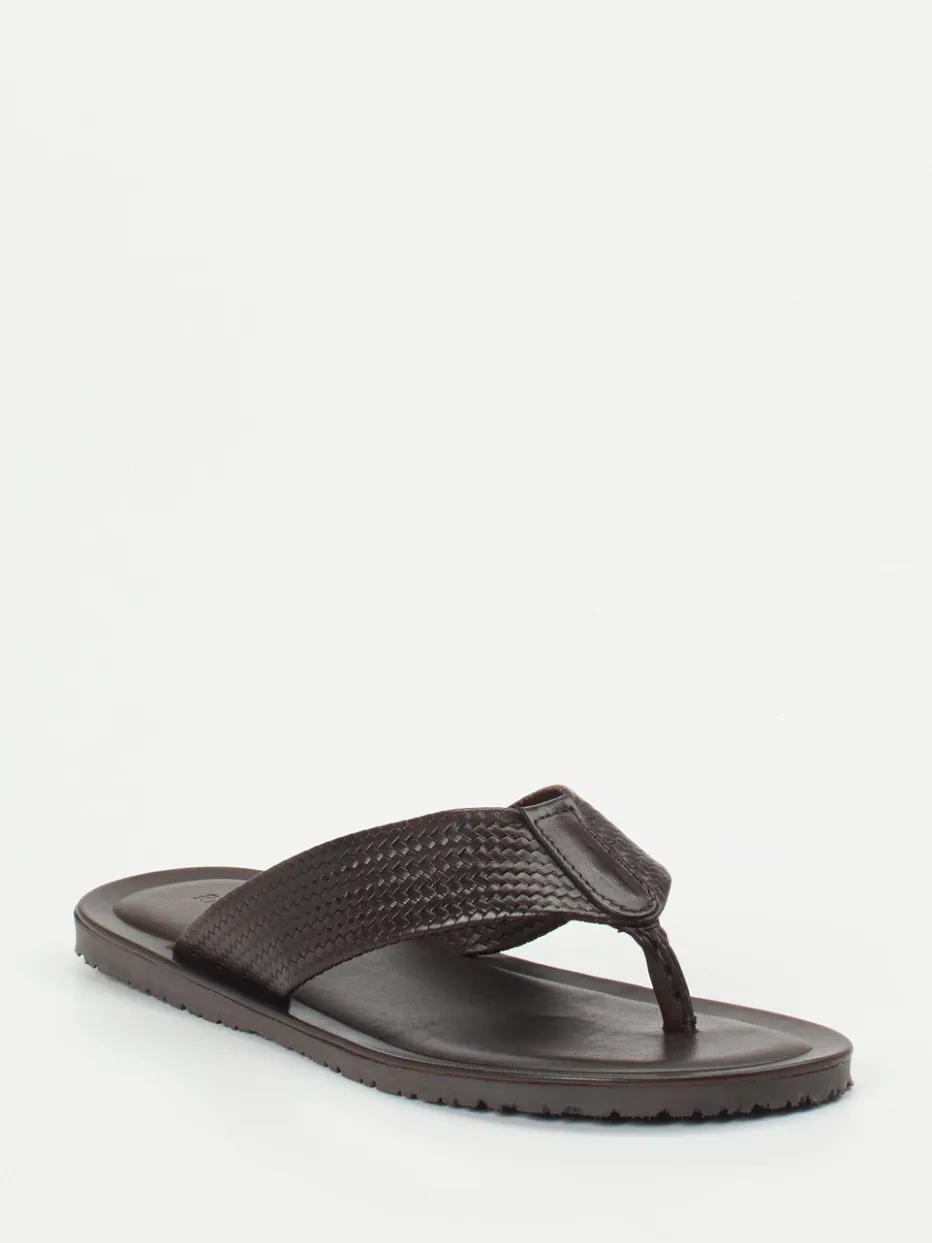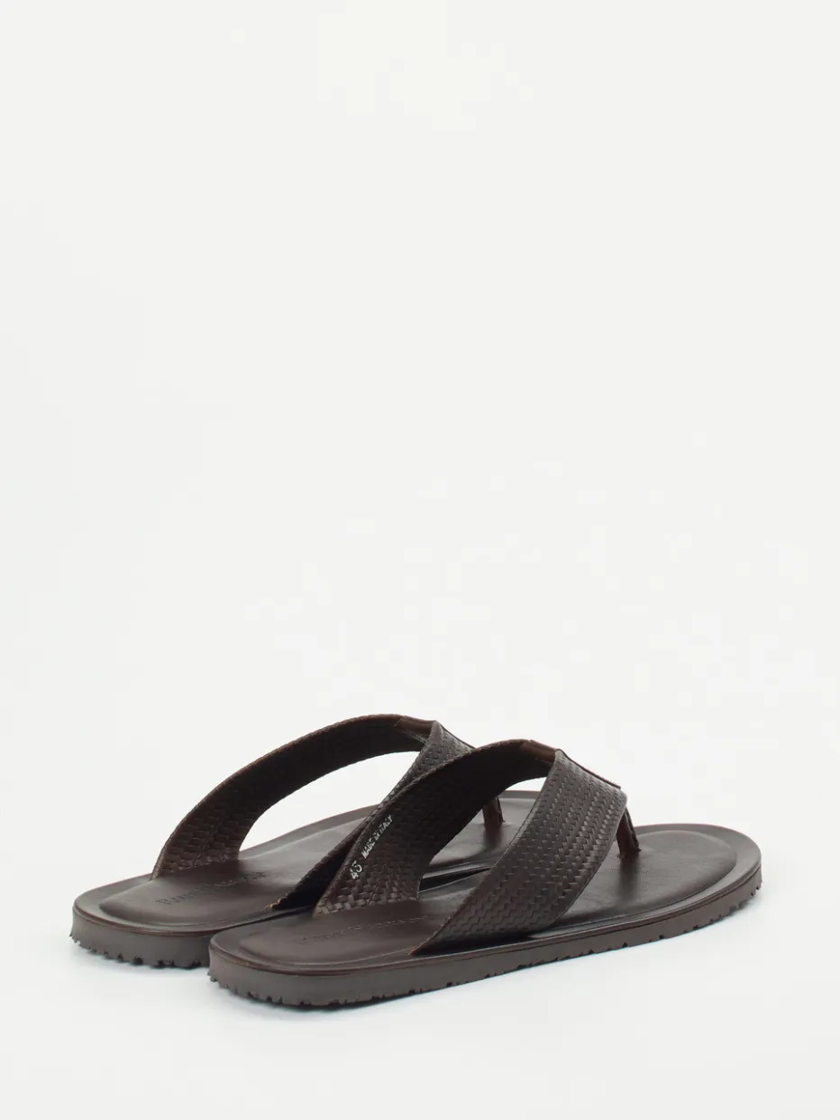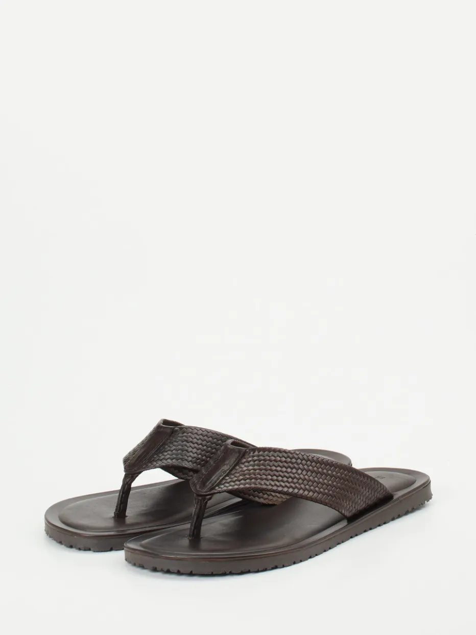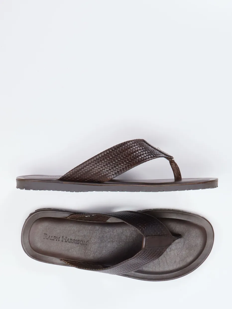 Sommerminimalismus in Flechtoptik.Ralph Harrison präsentiert mit diesen Zehentrennern ein klar gestaltetes Herrenmodell für den stilvollen Auftritt in Freizeit und Urlaub. Die flach gestaltete Silhouette aus dunkelbraunem Kalbleder mit samtig-matter Flechtoptik strahlt Understatement aus. Der praktische Einsteig ermöglicht schnelles Hineinschlüpfen, während das gepolsterte Fußbett mit Markenprägung hohen Tragekomfort bietet. Die profilierte Gummisohle sorgt für Trittsicherheit auf verschiedenen Untergründen. Inspiriert von Resortwear und dem Trend zu „Quiet Luxury“, passen diese Sandalen zu Leinenhosen oder Naturtönen. Italienische Handwerkskunst für formbewusste Sommertage.