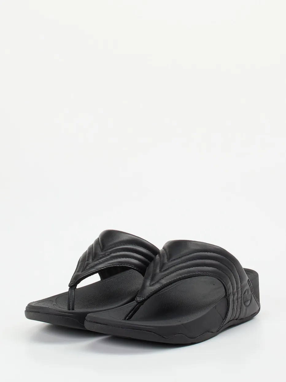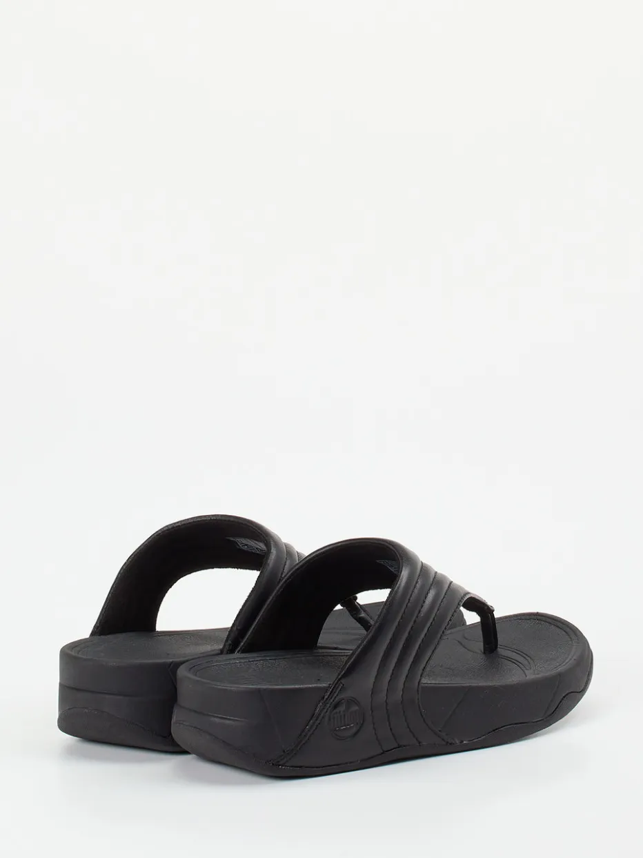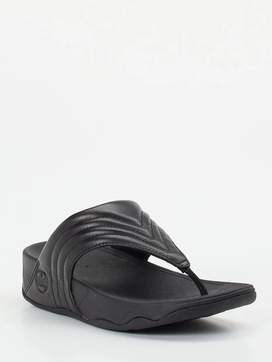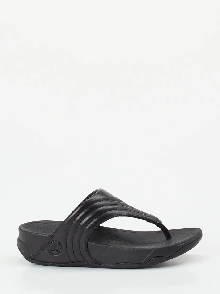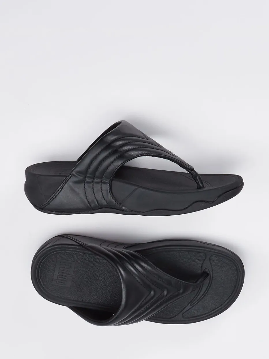 Komfort trifft minimalistisches Design.FitFlop präsentiert mit dieser Damen-Zehentrenner-Sandale ein Modell für entspannte Sommertage. Für Freizeit, Urlaub oder den Alltag zuhause: Das schwarze Kalbleder wirkt edel und ist sommerlich pflegeleicht. Der weich gepolsterte Riemen mit Ton-in-Ton-Steppung und seitlichem Logo ergänzt die ergonomisch geformte Microwobbleboard™-Sohle ideal. Die matte Oberfläche unterstreicht den unifarbenen, klaren Charakter – ideal für Monochrome Looks und Streetwear-affine Kombinationen. Besonders bequem durch die gedämpfte Gummisohle und die V-förmige Silhouette. Ein sommerlicher Begleiter, der Komfort und Stil souverän vereint.