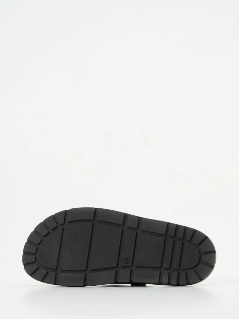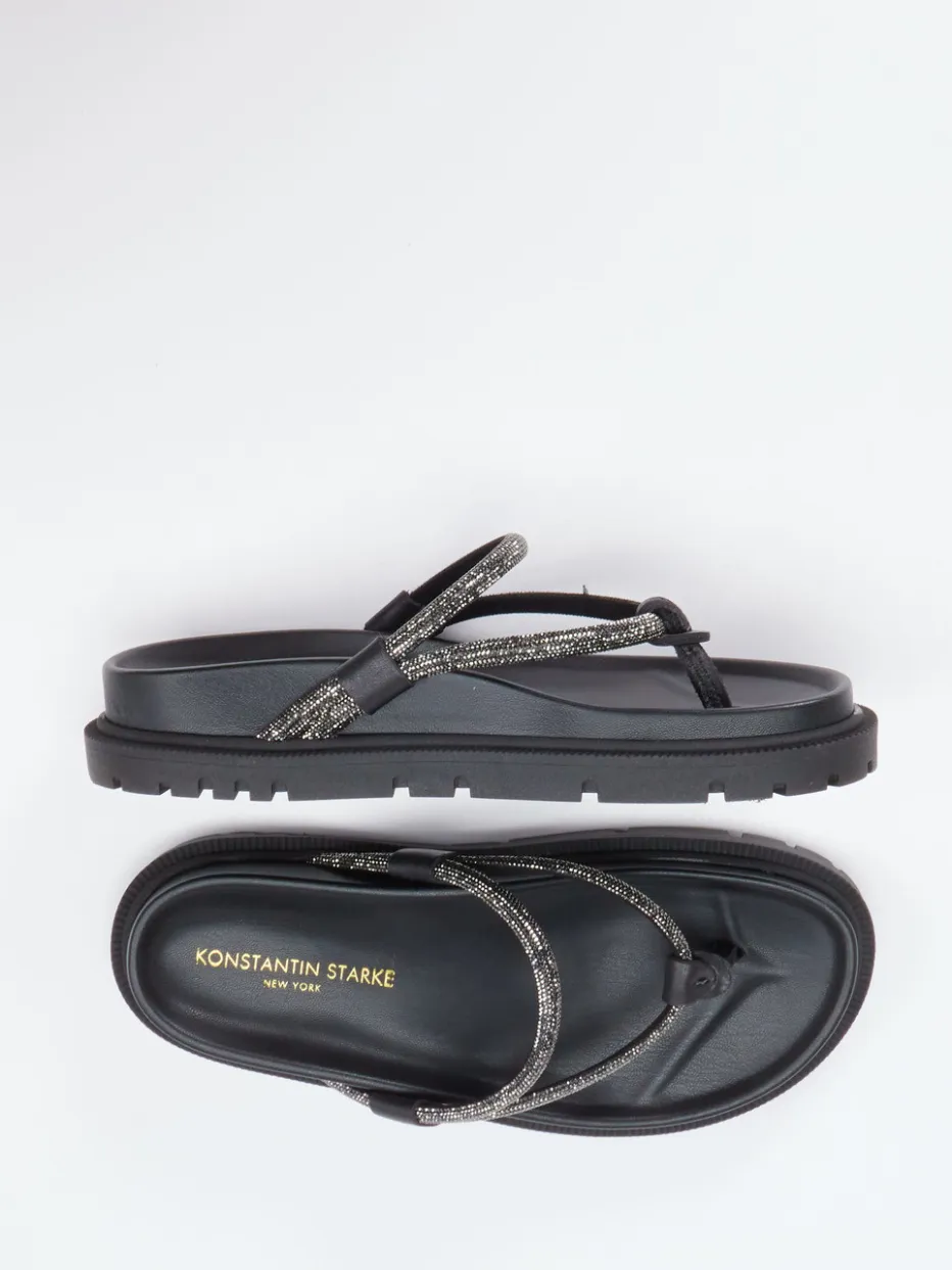Sommerflair mit trendiger Plateau-Silhouette.Konstantin Starke präsentiert eine feminine Sandale in Zehentrenner-Form, die Komfort und Stil harmonisch vereint. Für entspannte Tage in der Stadt oder Urlaubsmomente kombiniert das Design glitzerverziertes Metallic-Textil mit ergonomischem Kunstleder-Fußbett in Lederoptik. Die breite, rutschhemmende Gummisohle überzeugt mit robuster Plateau-Ausführung in mattem Schwarz. Schlupfform, grazile Riemen sowie silberfarbene Schmucksteine setzen edle Akzente. Dieser Style spiegelt sowohl Streetwear-Einflüsse als auch den Chunky-Sandals-Trend der Saison wider – perfekt zu fließenden Sommerkleidern und lässigen Beach-Looks. Ein Schuh, der optische Highlights bietet und Markencharakter stilvoll interpretiert.