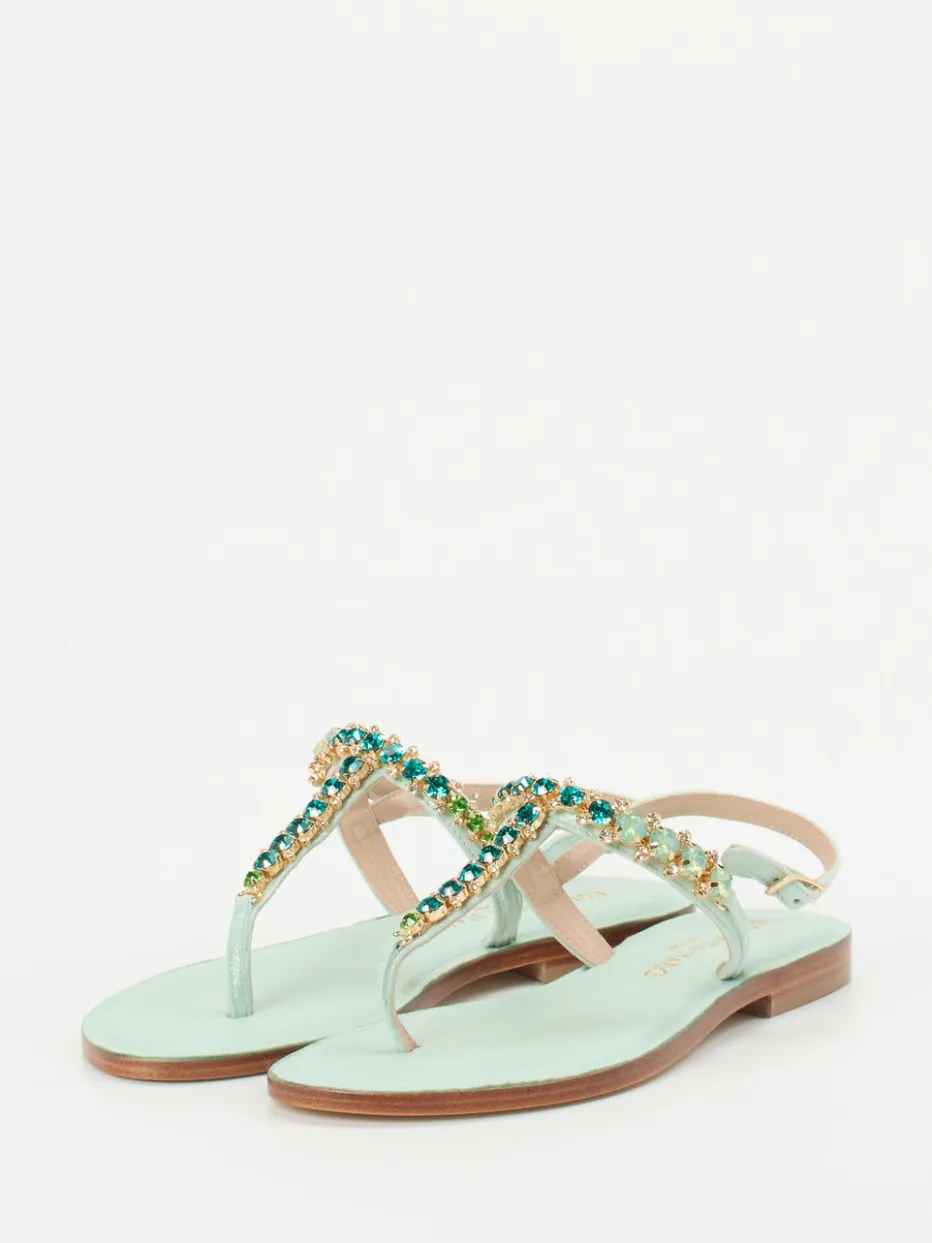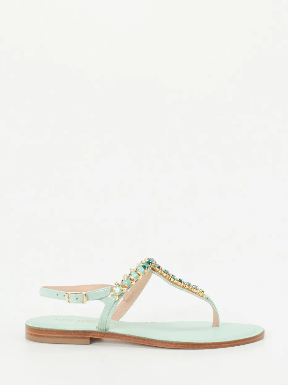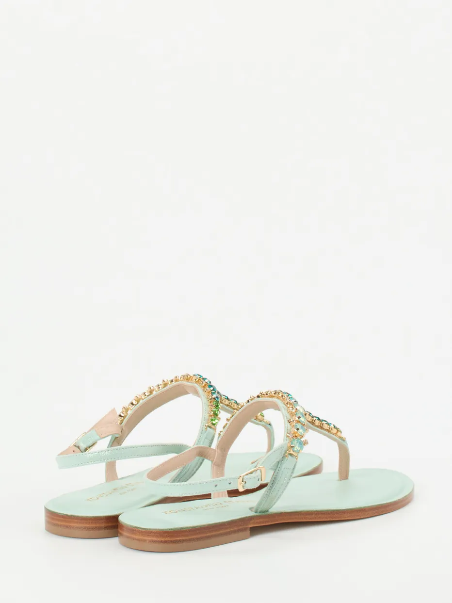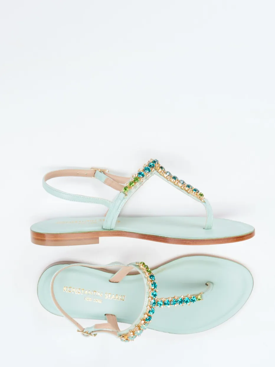Für stilvolle Sommertage gedacht.Konstantin Starke präsentiert mit dieser Zehentrenner-Sandale ein feminines Modell für die warme Jahreszeit. Ideal für sonnige Strandspaziergänge oder entspannte Ausflüge in der Stadt: Das feine Metallicleder in zartem Mintgrün zeigt eine glänzende Oberfläche und schmiegt sich elegant um den Fuß. Raffiniert inszeniert wird das schmale Riemendesign durch funkelnde Strasssteine im grünen Farbverlauf. Die goldene Dornschließe am verstellbaren Fersenriemen ergänzt das Open-Toe-Design stimmig. Die flache Ledersohle mit Polsterung sorgt für Tragekomfort, während der Look stark von aktuellen Pastell- und Resorttrends inspiriert ist. Ein sommerlicher Statement-Schuh mit handwerklichem Anspruch und raffinierter Farbgebung.