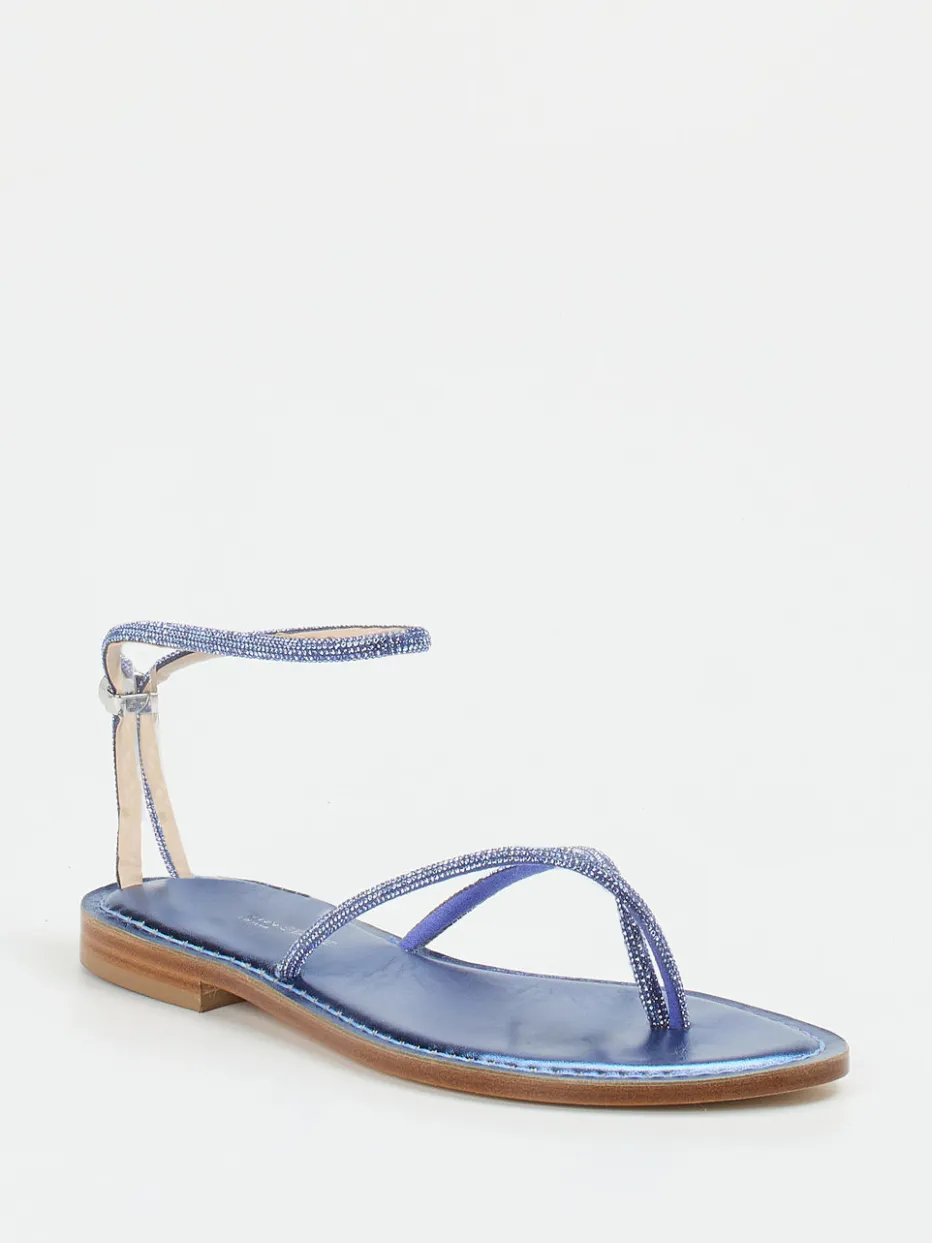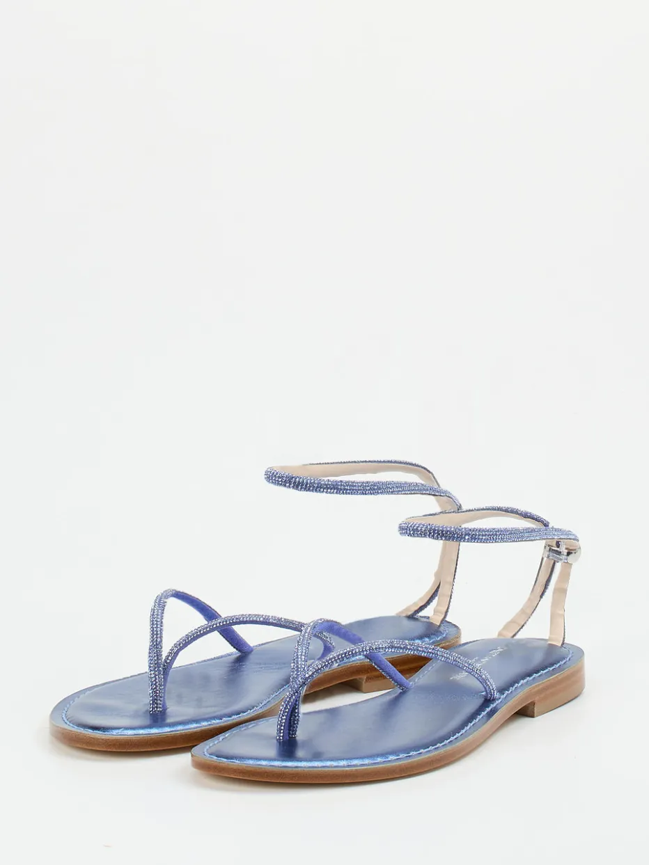 Strass trifft Saphirglanz.Die Marke Konstantin Starke präsentiert eine luxuriöse Damen-Zehentrenner-Sandale mit glänzendem Metallicleder. Ideal für Sommerabende und elegante Strandmomente, verbindet dieses Modell edlen Metallic-Glanz in Azurblau mit einem schimmernden Strassbesatz auf den schmalen Riemen. Die filigrane Silhouette ergänzt ein Schmuckstein am Knöchelriemen, während die offene Form und flache Ledersohle sommerliche Leichtigkeit versprechen. Der sichere Halt wird durch eine feine Dornschließe gewährleistet. Inspiriert vom Y2K-Revival überzeugt das Design mit moderner Raffinesse und modischem Understatement. Kombinierbar mit Metallic-Clutch und Maxikleid. Handwerklicher Chic für stilbewusste Sommerlooks.
