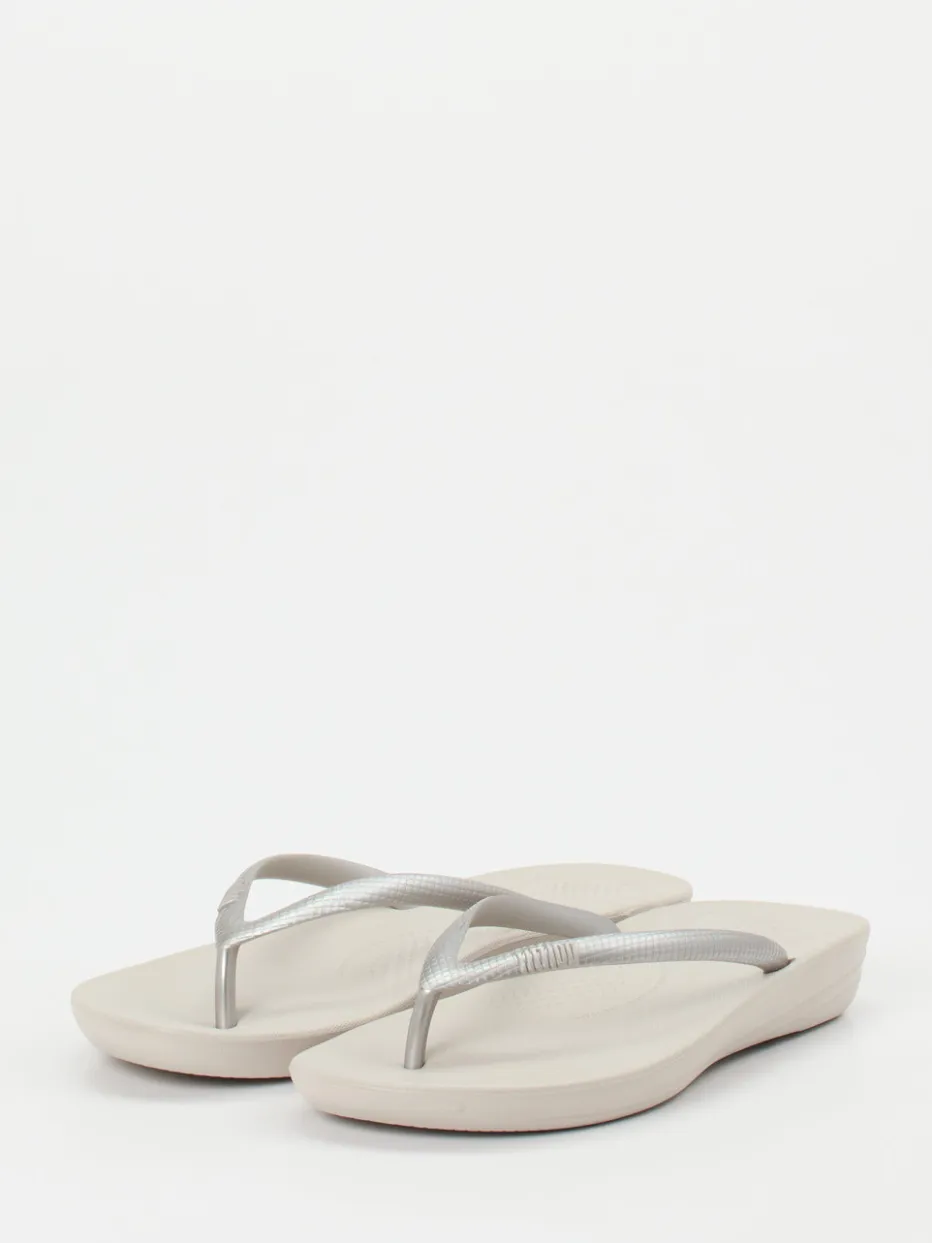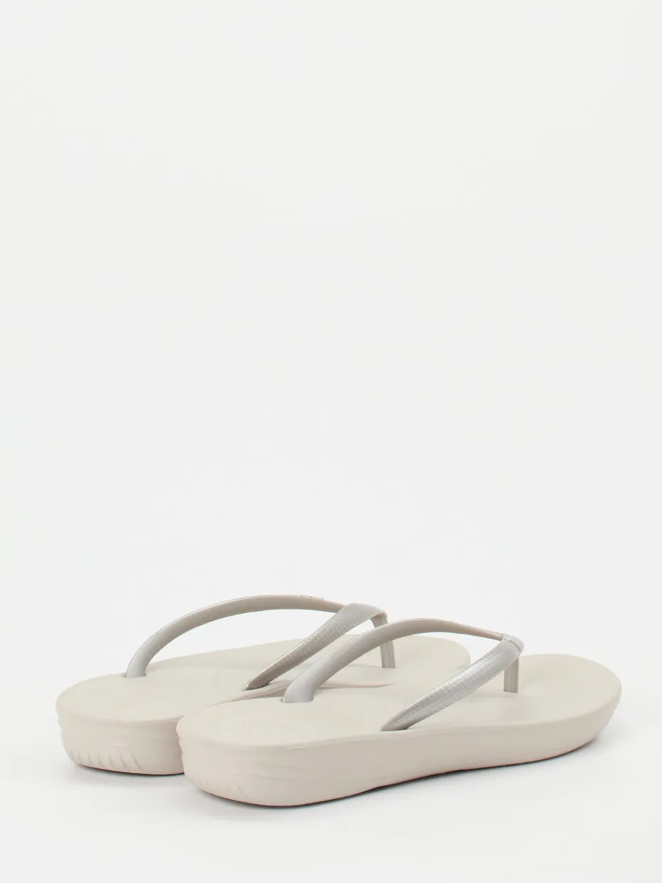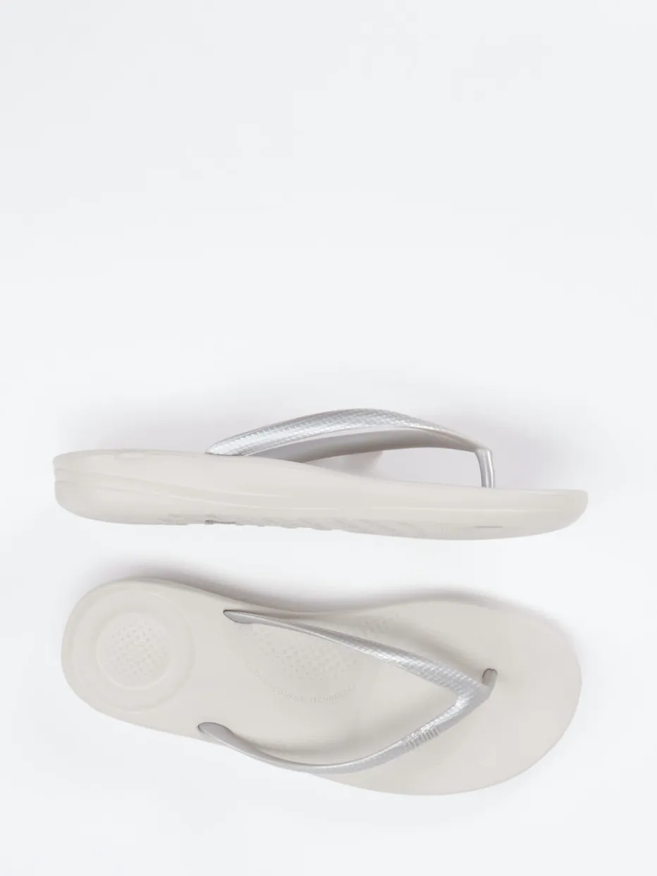 Minimalismus mit Funktion trifft Sommerfeeling.FitFlop präsentiert eine Damen-Zehentrenner-Sandale, die Stil und Bequemlichkeit perfekt ausbalanciert. Ideal für warme Tage in City oder am Meer: Das wasserabweisende Obermaterial aus Synthetik sorgt mit matt-silbernem Glanz für subtile Eleganz. Die flache Silhouette mit leichtem Keilabsatz und ergonomisch geformtem Fußbett stützt angenehm bei jedem Schritt. Der Schlupfeinstieg und die gepolsterte Innensohle betonen den auf Komfort ausgelegten, entspannten Charakter. Modisch im Quiet-Luxury-Trend verankert, passt sie zur Strandtasche wie zum Casual-Kaftan. FitFlop vereint Leichtigkeit mit ergonomischer Passform für stilbewusste Sommertage.