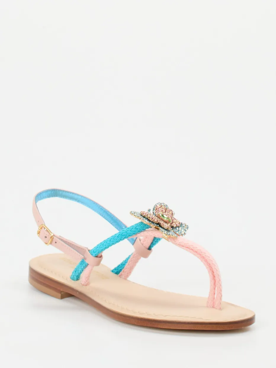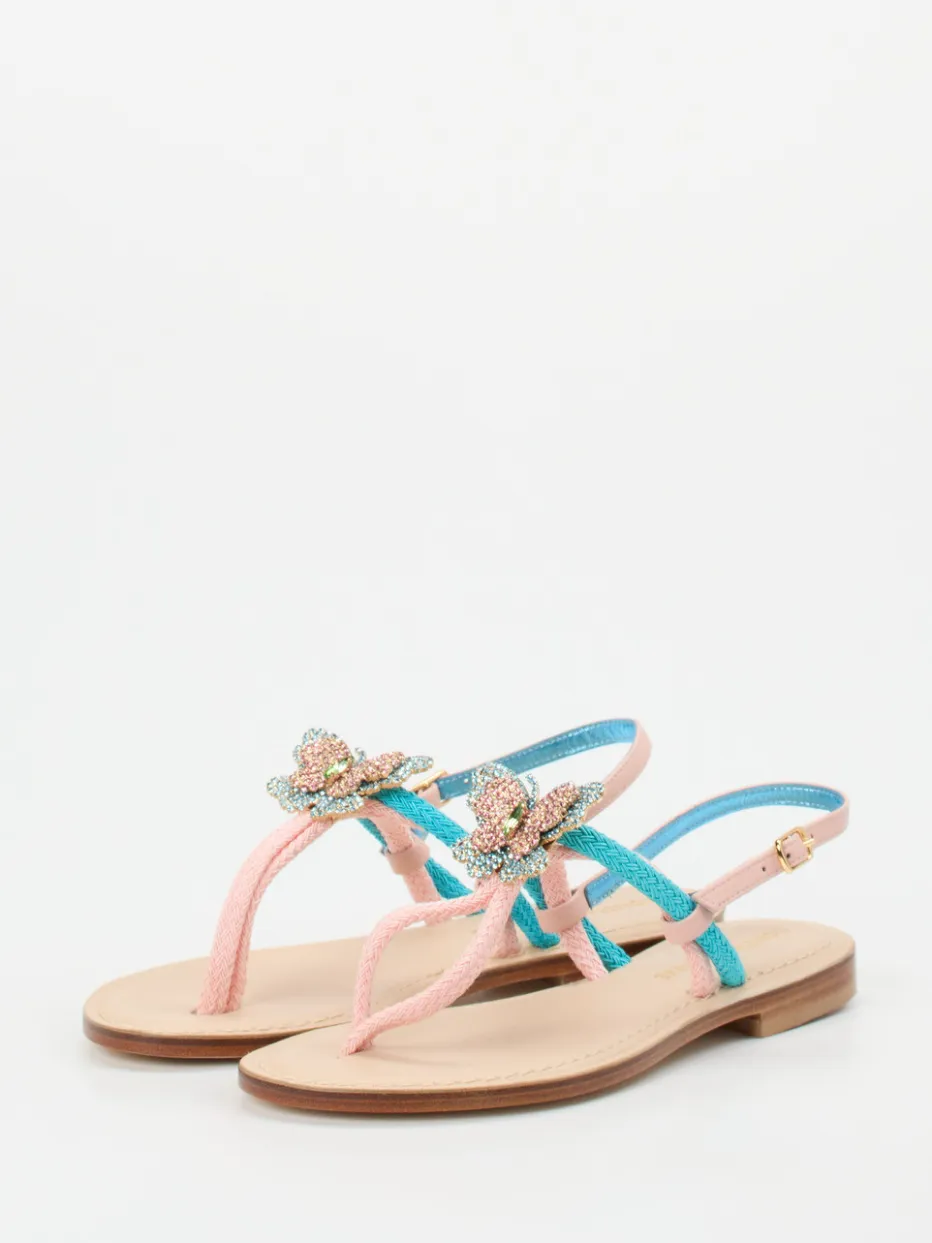 Diese Zehentrenner-Sandale vereint Boho-Ästhetik mit hochwertiger Verarbeitung. Der verspielte Materialmix und die funkelnde Blütendekoration setzen stilvolle Akzente für sommerliche Outfits.