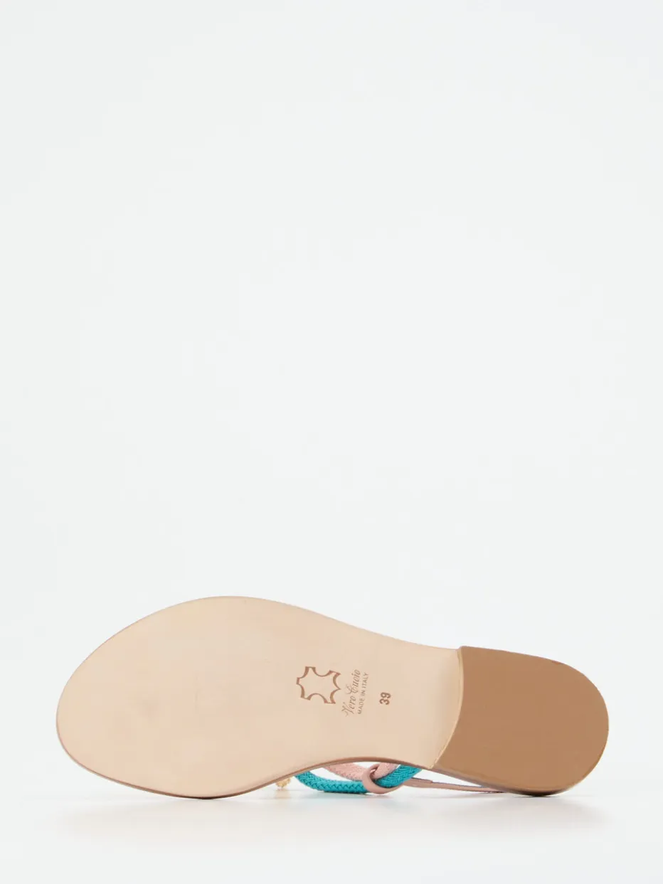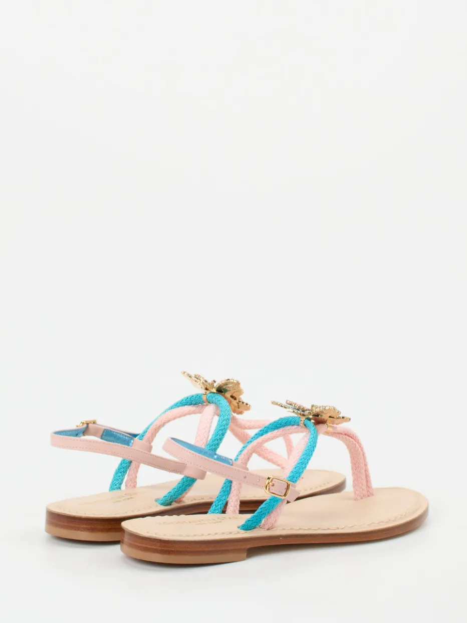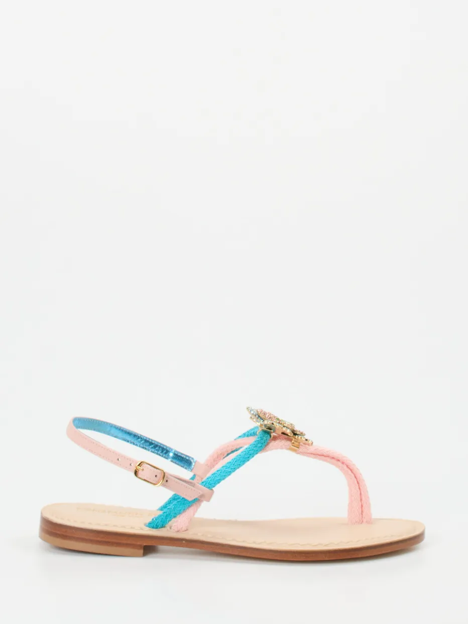 Blickfang am Fuß: Pastell trifft Glamour.Konstantin Starke präsentiert eine Zehentrenner-Sandale für Damen, die sommerliche Boho-Leichtigkeit mit präziser Handwerkskunst verbindet. Ideal für Urlaubstage oder Freizeitlooks besticht das Modell durch einen Materialmix aus Textil und glattem Leder. Der geflochtene Riemen in Rosé und Türkis wird durch eine strassbesetzte Blütenapplikation betont. Eine goldfarbene Schnalle am Fersenriemen ermöglicht individuelle Anpassung. Die Kombination aus weichem, lederbezogenem Fußbett und flacher Ledersohle verspricht Komfort und Eleganz. Aktuelle Y2K-Anleihen und Pastelltöne verleihen dem Design zeitgemäßen Ausdruck. Perfekt kombinierbar mit fließenden Stoffen und leichten Farben. Klare Formensprache trifft auf charaktervollen Stil – Konstantin Starke setzt ein modisches Statement.