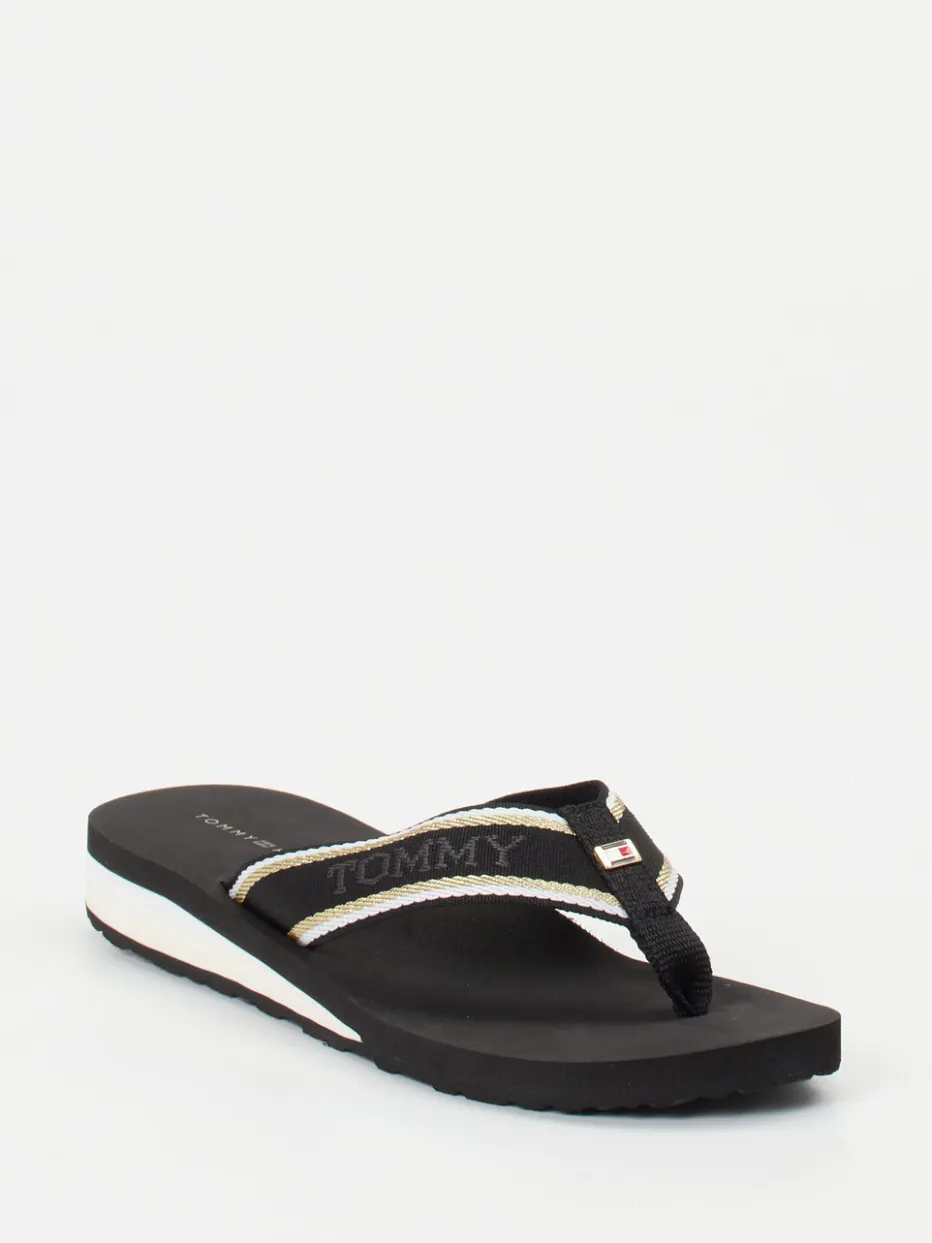 Sommer-Essential mit markantem Logo-Akzent.Tommy Hilfiger interpretiert den Klassiker der Badepantolette neu. Die Damen-Zehentrenner kombinieren schwarzes Textil mit matter Oberfläche und einem soften Innenleben für optimalen Tragekomfort. Goldgelbe und weiße Akzente am Riemen setzen Markenlogos stilvoll in Szene. Die klassische, flache Silhouette erhält durch die leicht keilförmige EVA-Sohle einen modernen Plateau-Effekt. Ideal für Strandtage, Poolbesuche oder entspannte Sommermomente in der Stadt. Lässt sich vielseitig zu Leinenkleid oder Shorts im Streetwear-Stil kombinieren. Verbindet Stilbewusstsein mit funktionalem Komfort – typisch Tommy Hilfiger.