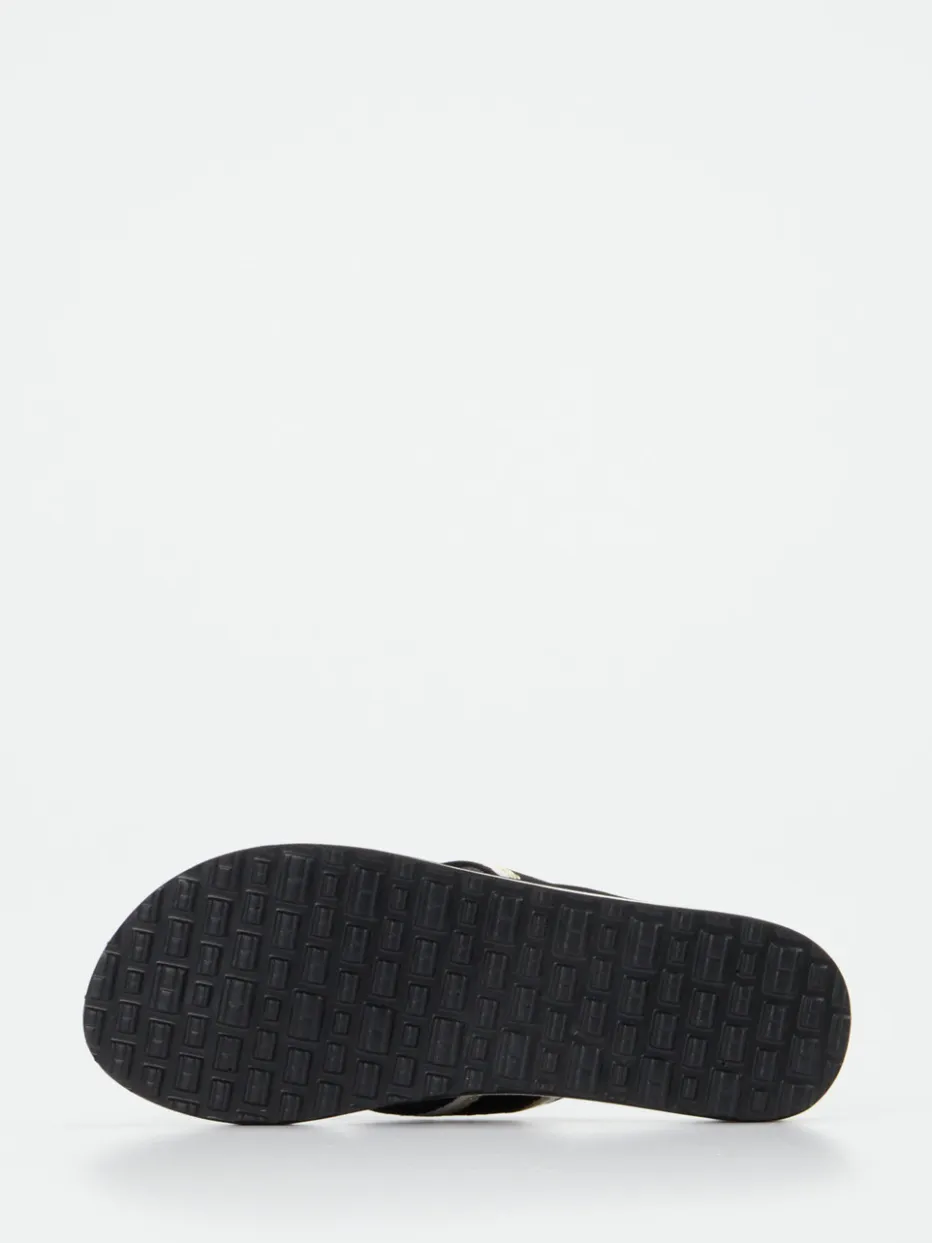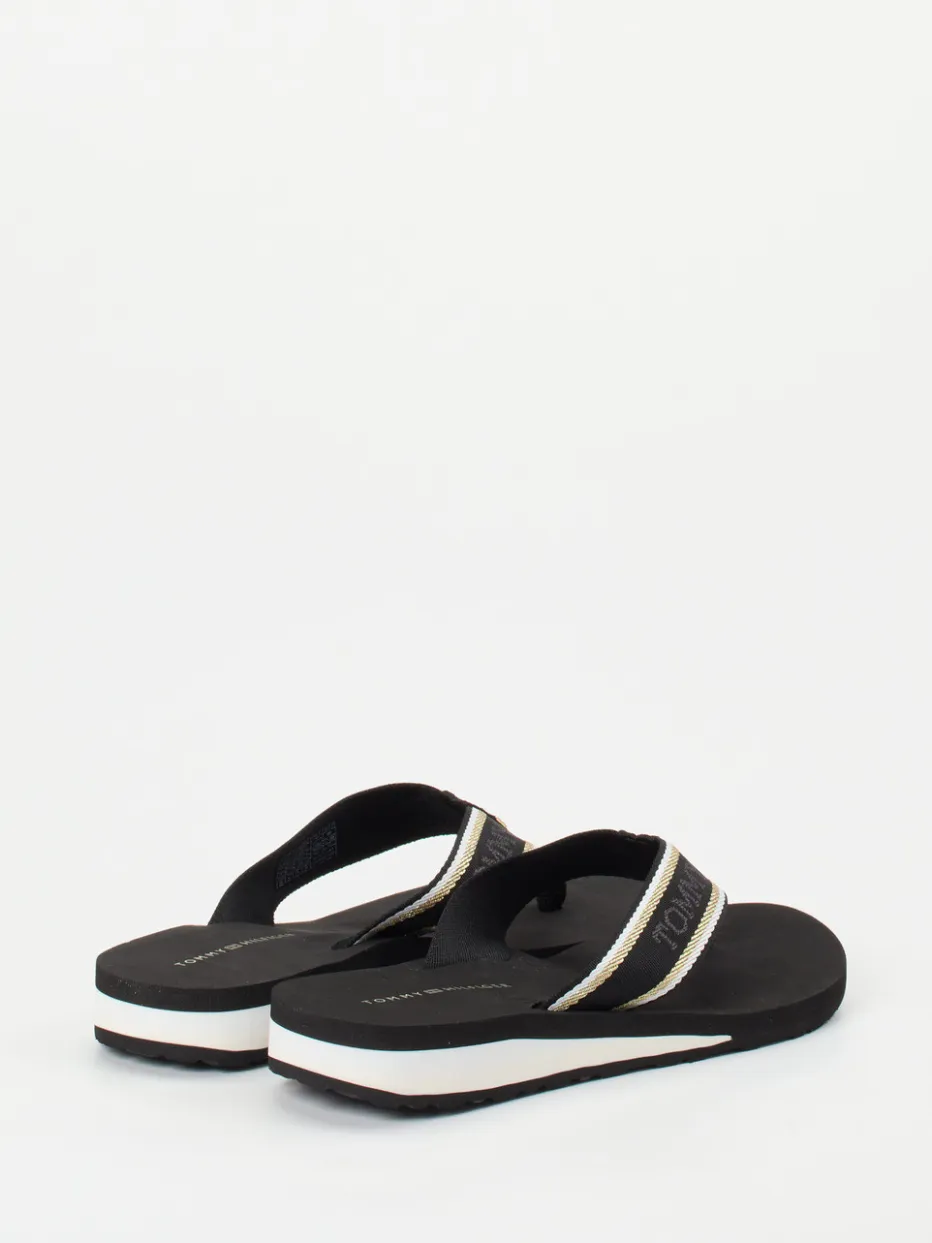 Der leichte Zehentrenner von Tommy Hilfiger überzeugt durch sein minimalistisches Design, akzentuiert mit kontrastierenden Logo-Details und einer dezent erhöhten Sohle.