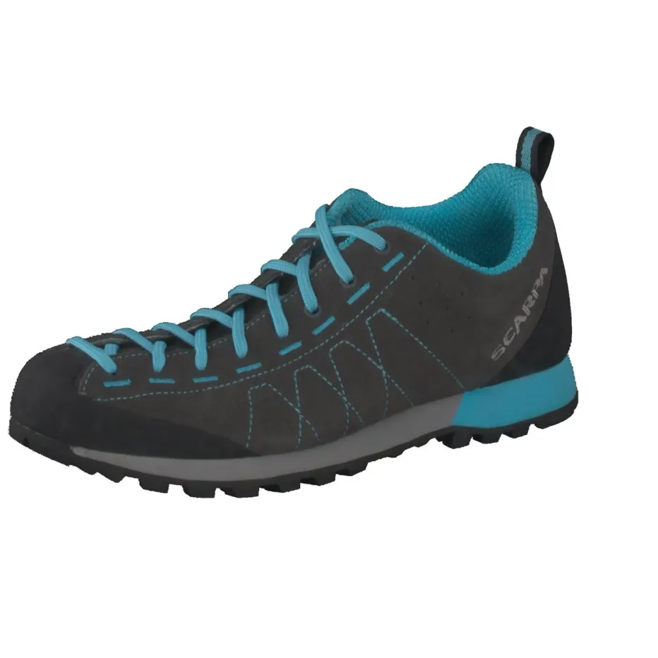 Outdoor-Stil mit urbanem Anspruch.Scarpa präsentiert mit diesem Zustiegsschuh einen vielseitigen Allrounder für Freizeit und Gelände. Dank robustem Veloursleder mit samtiger Oberfläche und atmungsaktivem Mesh-Innenfutter ist der Schuh optimiert für Zustiege, Tageswanderungen oder aktive Alltagseinsätze. Die flache, sportliche Silhouette in Anthrazit wird akzentuiert durch türkisfarbene Kontrastnähte und markante Neunloch-Schnürung. Eine hochgezogene Zehenkappe und die kräftig profilierte Vibram-Gummisohle sorgen für Schutz und Grip im unwegsamen Terrain. Gorpcore-typisch lässt sich das Modell auch stilbewusst zur Performancewear kombinieren. Maximale Bodenhaftung und Komfort – Outdoor-Kompetenz von Scarpa.