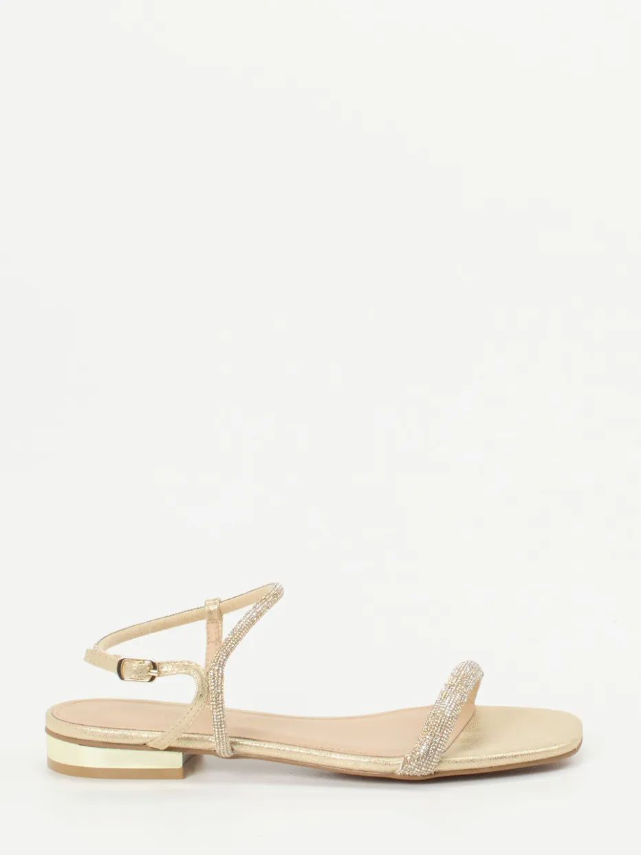 Ob bei einer eleganten Sommerhochzeit oder einem besonderen Abend-Event: Das schimmernde Metallicleder in edlem Goldton und die feinen Riemchen mit Strassbesatz setzen luxuriöse Akzente. Die filigrane Silhouette mit verstellbarem Knöchelriemen und flachem Metallic-Absatz bietet Komfort und sicheren Halt. Der dezente Glanz und die klaren Linien spiegeln den Trend zu „Quiet Luxury“ und aktuellen Metallic-Akzenten wider. Kombiniert mit Abendkleidern in Nude-Tönen entsteht ein harmonisches Gesamtbild.
