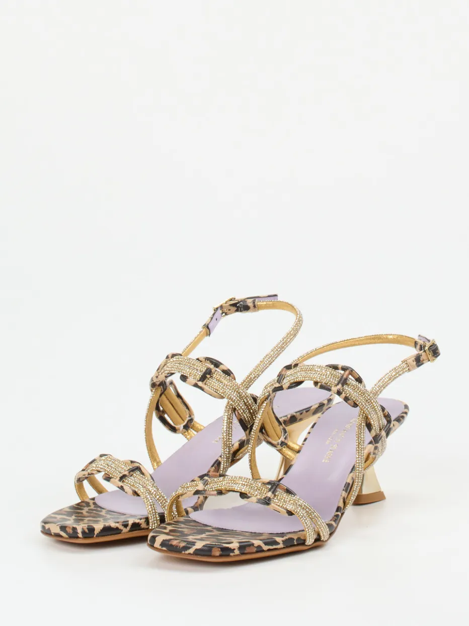 Ideal für Events mit Dresscode oder Clubnächte: Das fein geprägte Leder in braunem Leoprint trifft auf glitzernde Strassdetails und ein glänzendes Finish. Die offene, filigrane Silhouette mit Fesselriemen und goldfarbener Schnalle sorgt für sicheren Halt und visuelle Raffinesse. Ein 5 cm hoher Kitten Heel rundet den Look edel ab und unterstreicht modische Y2K-Vibes. Die Laufsohle aus Leder, kombiniert mit gepolstertem Fußbett, verspricht angenehmen Tragekomfort auch bei langen Abenden. Mit metallicfarbener Clutch ein perfektes Ensemble.