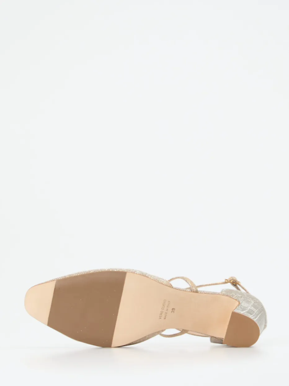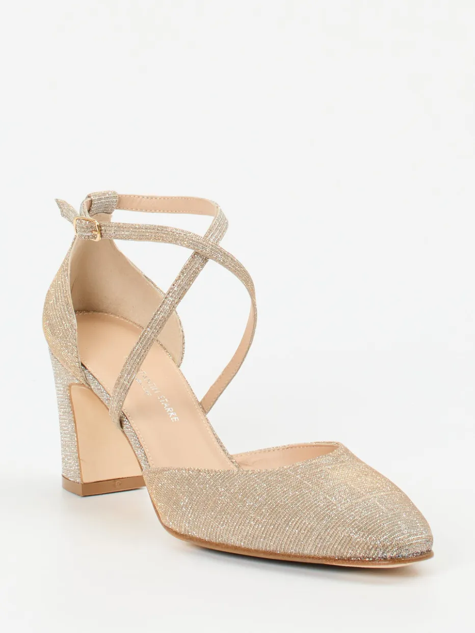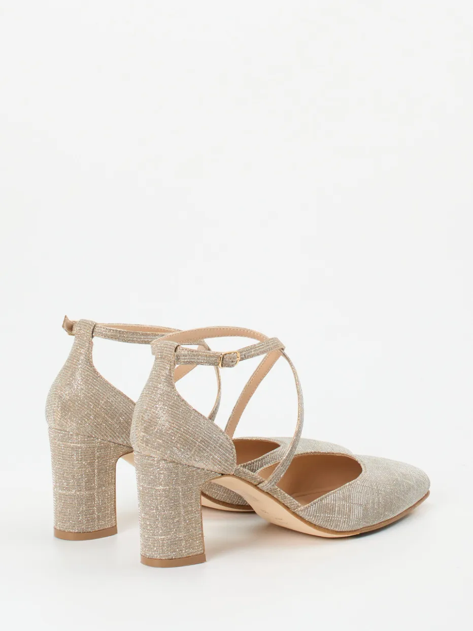 Die funkelnde Oberfläche in Champagner-Gold und die überkreuzten Riemen verleihen diesem Modell eine besonders elegante Ausstrahlung – perfekt für stilvolle Abendveranstaltungen.