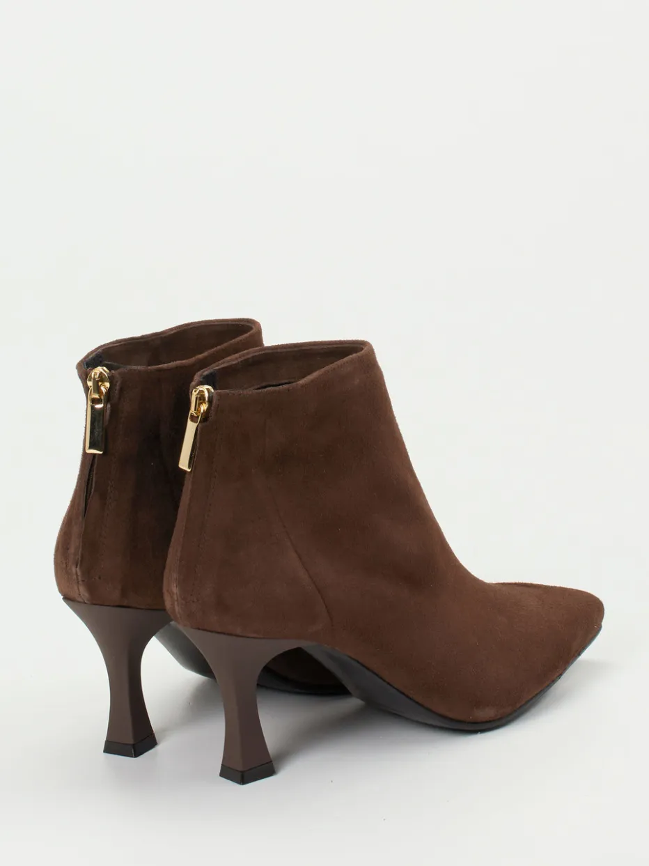 Diese Ankle Boots verbinden samtig schokobraunes Veloursleder mit einer femininen Silhouette und stilvollem Kitten Heel – ein gelungener Mix aus Eleganz und Retro-Charme.