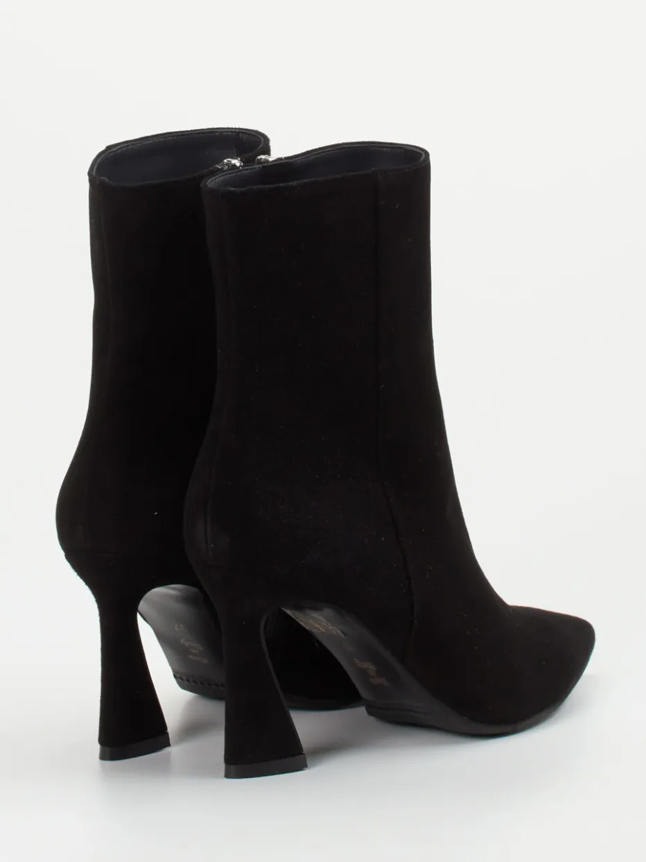 Für festliche Abende oder formelle Events geschaffen, überzeugt das Modell mit schwarzem Veloursleder, samtig angeschliffen und matt im Finish. Der spitz zulaufende Leisten und der skulptural geformte, leicht ausgestellte Absatz unterstreichen das minimalistische Design. Ein Innenseitenreißverschluss sorgt für Komfort, während die glatte Gummisohle mit Lederanteil dezent bleibt. Modisch aktuell im Trendfeld „Quiet Luxury“, passt der Schuh zu klar geschnittenen Mänteln oder monochromen Outfits.