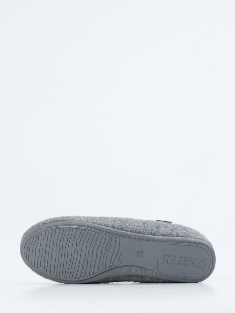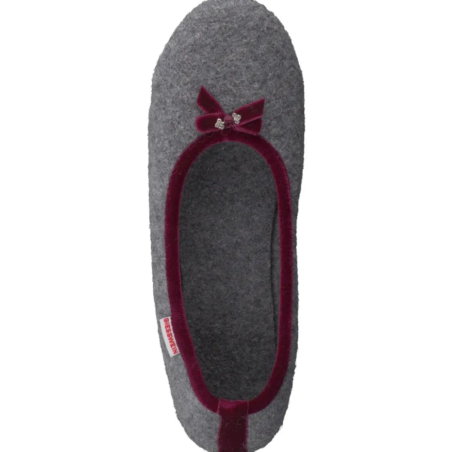 Eleganter Komfort trifft feminine Details.Giesswein präsentiert hier einen klassischen Damenhausschuh im Ballerina-Stil. Ob beim Frühstücksbuffet im Chalet oder an entspannten Winterabenden – der geschlossene Schlüpfschuh aus filzigem Wollfilz in Mittelgrau passt sich jeder Relax-Situation an. Der elastische Einstieg sorgt für bequemen Halt, während das fein gearbeitete Veloursband in Bordeaux mit Zierschleife und Strassdetail feminine Akzente setzt. Die flexible Gummisohle bietet Rutschfestigkeit auf glatten Böden und macht den Schuh zum praktischen Begleiter im Haus. Loungewear-typisch und inspiriert vom Cottagecore-Trend. Natürliche Wärme und raffinierter Stil – typisch Giesswein.