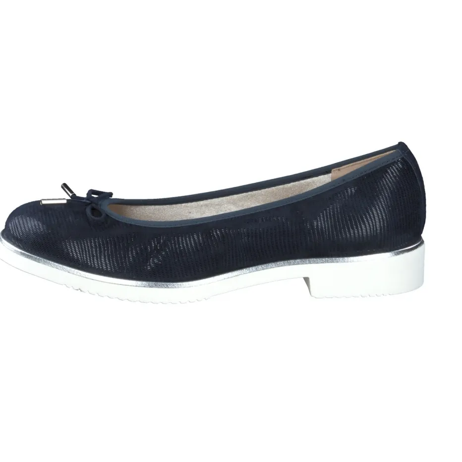 Die Marke Cinzia Valle zeigt mit diesen Komfort-Ballerinas eine zeitlose Variante für Damen mit hohem Design- und Bequemlichkeitsanspruch. Ideal für stilvolle Berufstage oder entspannte Stadtausflüge: Das geprägte Leder in tiefem Dunkelblau überzeugt mit matter Oberfläche und subtiler Struktur. Eine filigrane Schleife mit silberfarbenen Metallenden setzt einen femininen Akzent zur klassisch runden Form. Die weiße Leichtzellsohle mit silberner Zierkante sorgt zusammen mit der weich gepolsterten Innensohle für alltagstauglichen Laufkomfort. Inspiriert vom Trend ‘Quiet Luxury’, harmoniert der Look mit dunkler Stoffhose oder Silber-Accessoires. Hochwertige Details treffen auf gehobenen Komfort – typisch Cinzia Valle.
