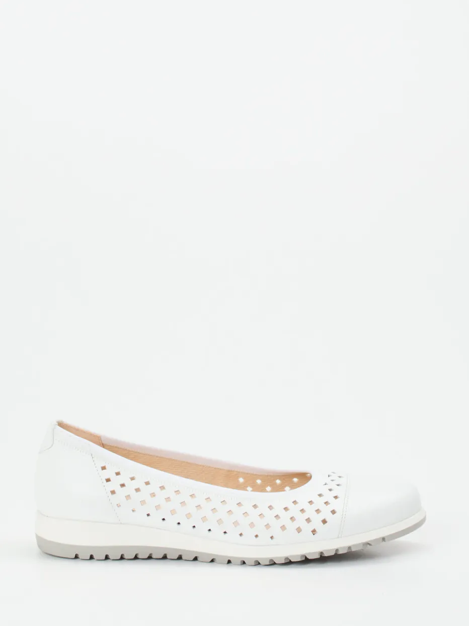 Ob Büro oder Freizeit: Diese Ballerinas überzeugen durch weiches, weißes Kalbleder mit matter Oberfläche und atmungsaktiver Lochstruktur. Die abgerundete Silhouette ergänzt das feminine Design, während die tonale Ripsband-Einfassung und strukturierte Gummisohle für sicheren Halt sorgen. Die weich gepolsterte Komfort-Innensohle unterstützt ein ermüdungsfreies Gehen. Inspiriert vom Trend „Quiet Luxury“ bieten die Schuhe einen luftig-leichten Stilakzent für minimalistische Outfits. Ideal kombinierbar mit Leinenhose oder Sommerbluse.