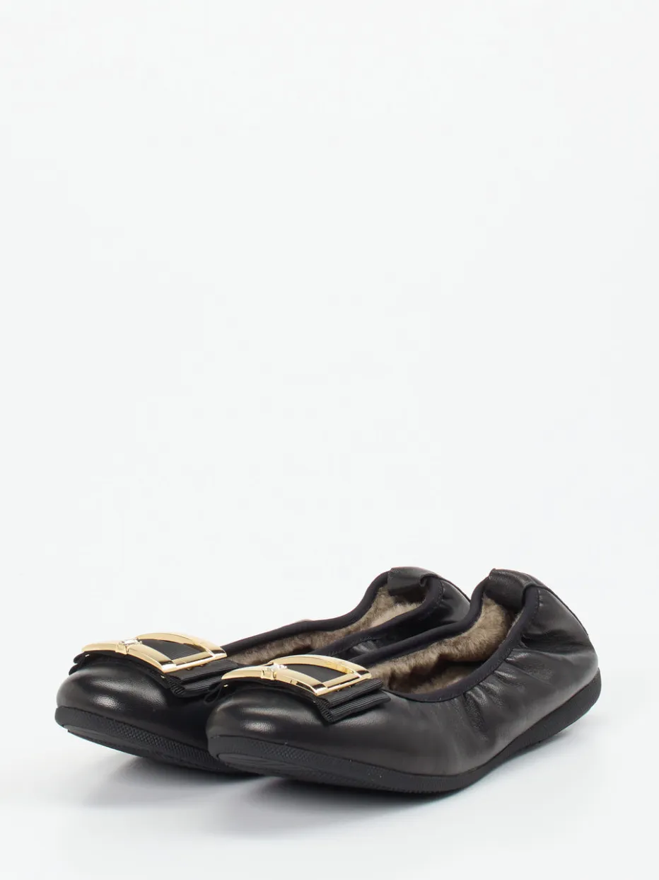 Wärmender Chic für kühlere Tage.La Ballerina präsentiert klassische Damen-Ballerinas mit saisonalem Komfort. Ideal für Büro oder Alltag in der kalten Jahreszeit: Der feine, rund geschlossene Schlupfschuh besteht aus geschmeidigem Lammleder mit matter Anmutung und trägt innen wärmendes Lammfell. Eine goldfarbene Schnalle mit toniger Textilschleife verleiht dezente Raffinesse, während der elastische Einstieg und die flexible, rutschhemmende Gummisohle Komfort schaffen. Der klassische Look in tiefem Schwarz lässt sich vielseitig kombinieren – von Kaschmir-Pullover bis Hosenanzug. La Ballerina steht für Qualität, Stil und Leichtigkeit in jeder Saison.