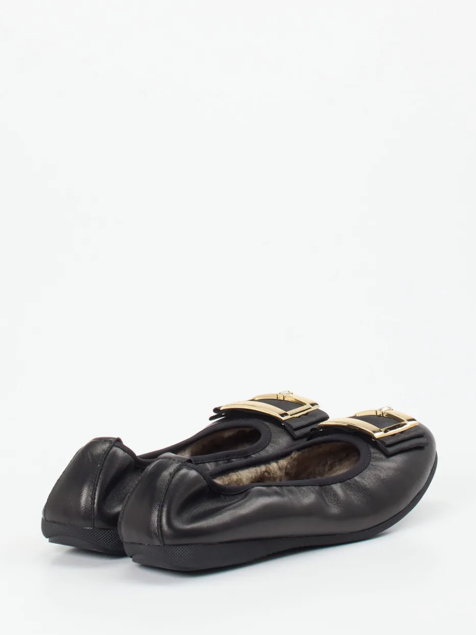 Diese klassischen Ballerinas verbinden elegantes schwarzes Lammleder mit einem warmen Innenfutter aus Lammfell – ideal für stilvolle Looks an kühleren Tagen.