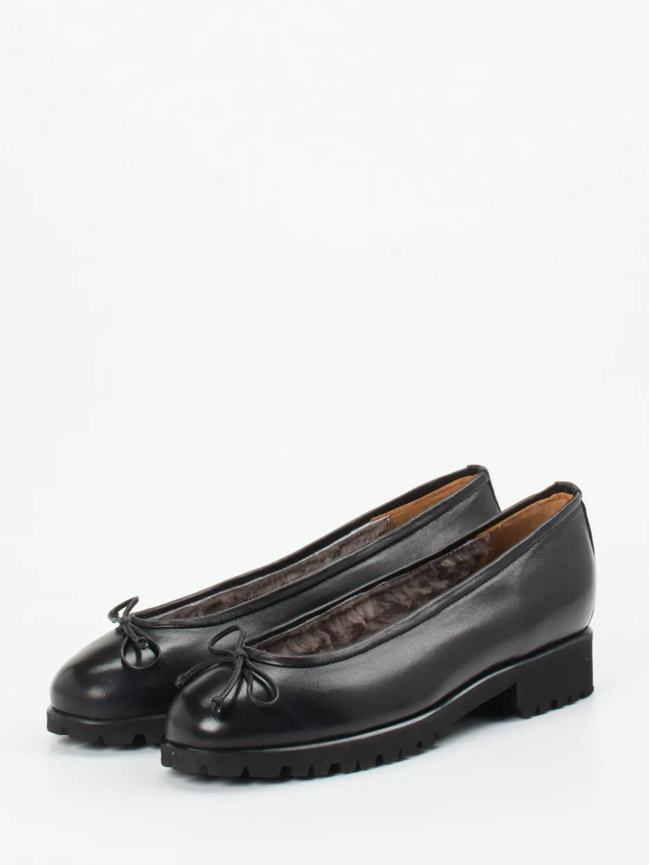 Winterkomfort mit klassischem Chic.Die Damen-Ballerinas von Mannori vereinen elegantes Design mit funktionaler Wärme. Ideal für kalte Alltagstage oder gemütliche Momente zu Hause: Das fein glänzende schwarze Lammleder harmoniert mit der traditionell runden Form und einer Ton-in-Ton Zierschleife. Innen sorgt kuscheliges Lammfell für angenehm warme Füße, während die profilierte Porosohle aus Gummi sicheren Tritt bietet – auch bei nasskaltem Wetter. Das Modell greift Minimalismus und Hybrid-Flats-Trends auf und spricht stilbewusste Komfortliebhaberinnen an. Ein hochwertiger Alltagsbegleiter mit klarer Formensprache und urbaner Funktionalität.