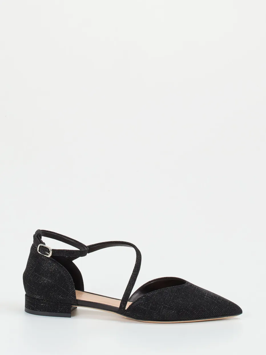 Schimmerndes Metallic-Textil, eine spitz zulaufende Silhouette und filigrane Riemenführung verleihen diesen Ballerinas einen festlich-eleganten Charakter.