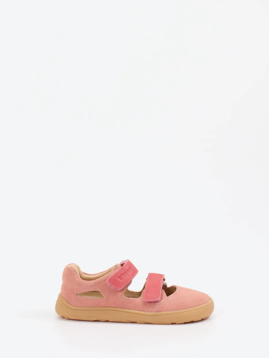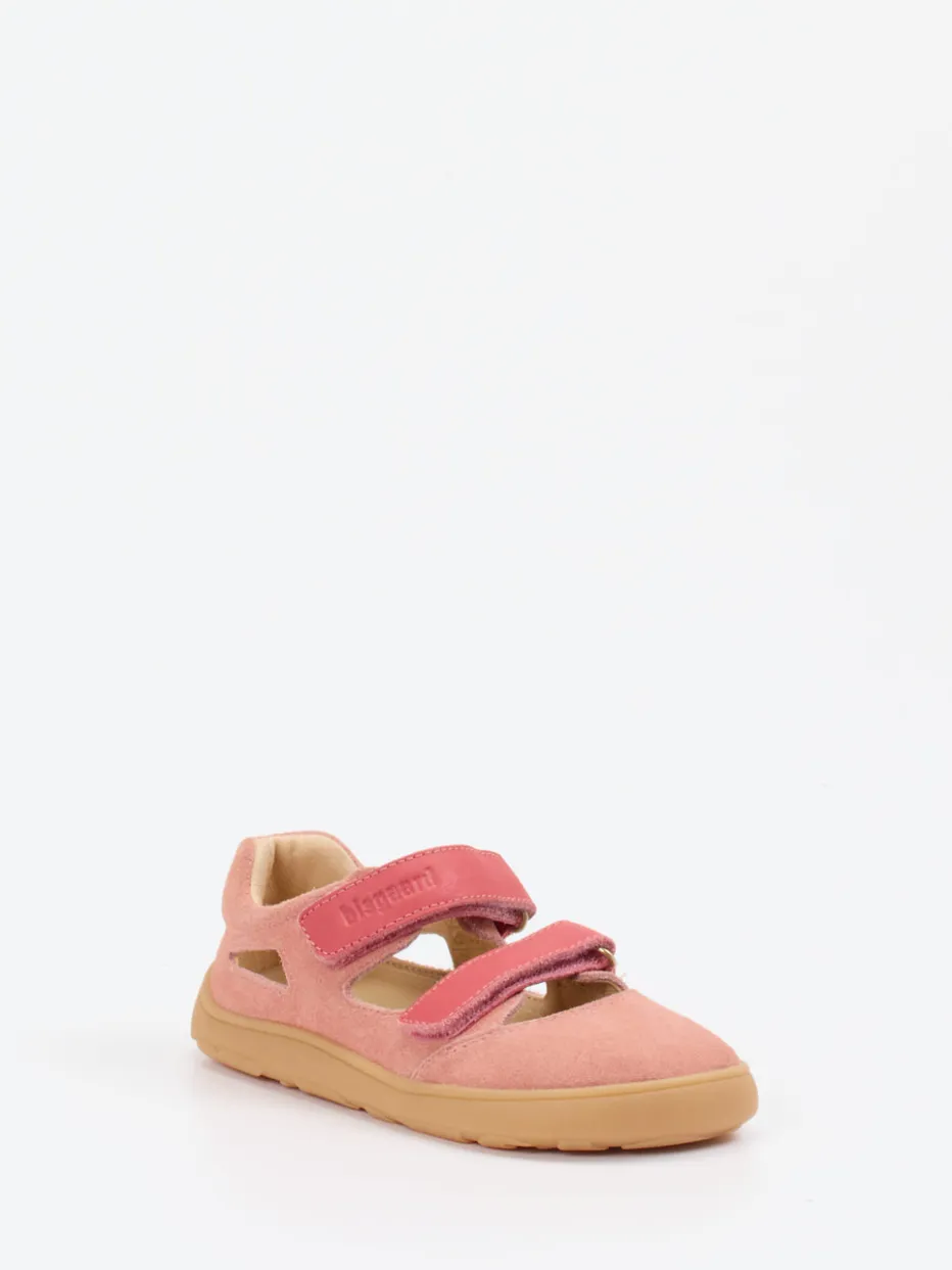 Leichtigkeit für sommeraktive Kinderfüße.Bisgaard präsentiert eine stilvolle Barfußsandale für Kinder, gefertigt aus samtig weichem Veloursleder. Ideal für warme Tage im Freien bietet diese altrosafarbene Sandalette mit korallfarbenen Klettverschlüssen und geschlossener Ferse sicheren Halt und Bewegungsfreiheit. Die geschwungene Form mit Cut-Outs unterstützt die natürliche Fußentwicklung, während die flexible Gummisohle ein Barfußgefühl vermittelt. Ton-in-Ton-Nähte und Logoprägung unterstreichen das skandinavisch inspirierte Design im minimalistischen Stil. Perfekt für Freizeitlooks mit leichter Sommerkleidung kombinierbar. Ein ausbalanciertes Kinderschuhmodell mit Fokus auf Komfort und Bewegungsfreiheit – typisch Bisgaard.
