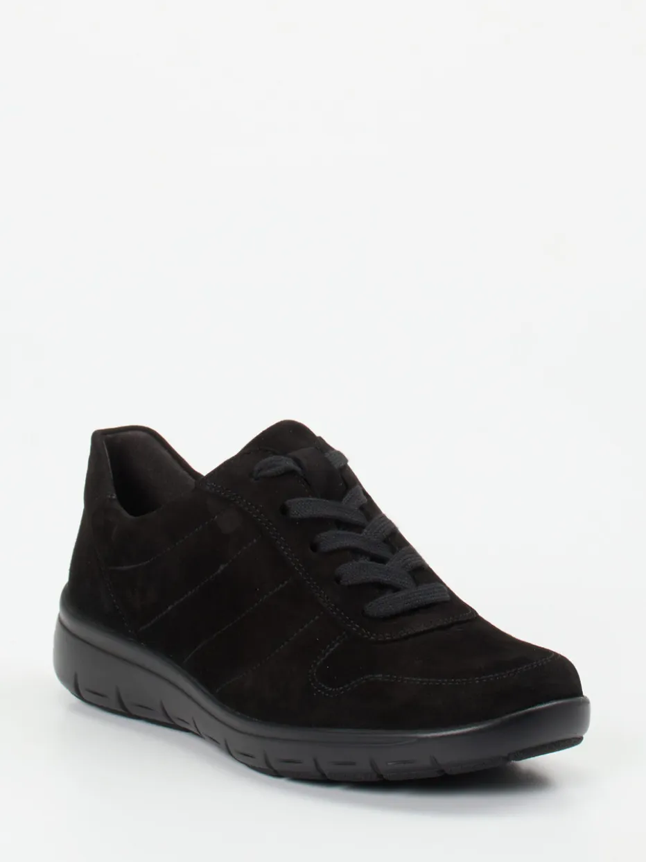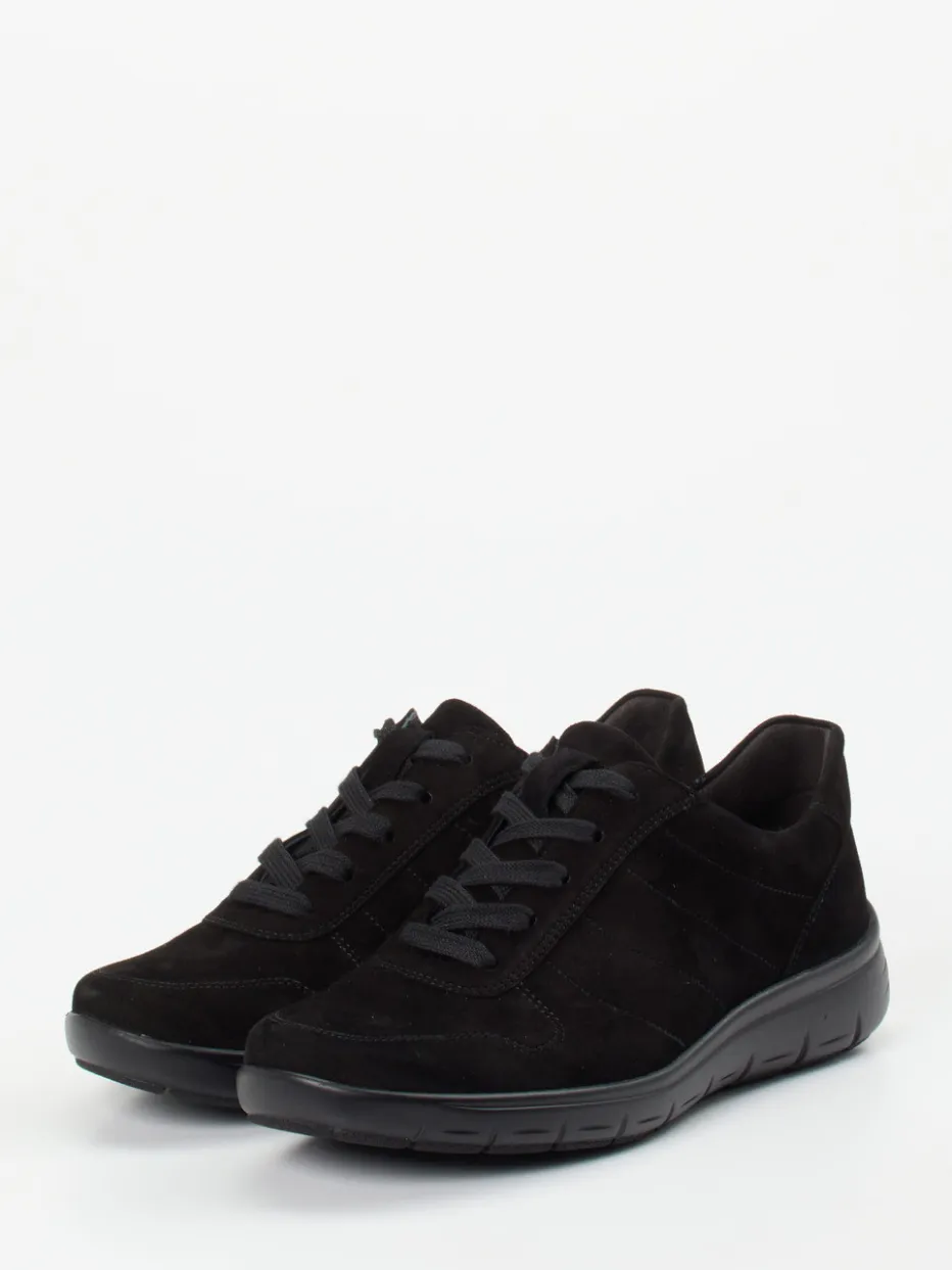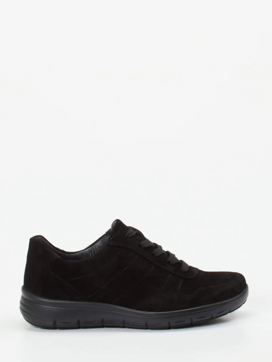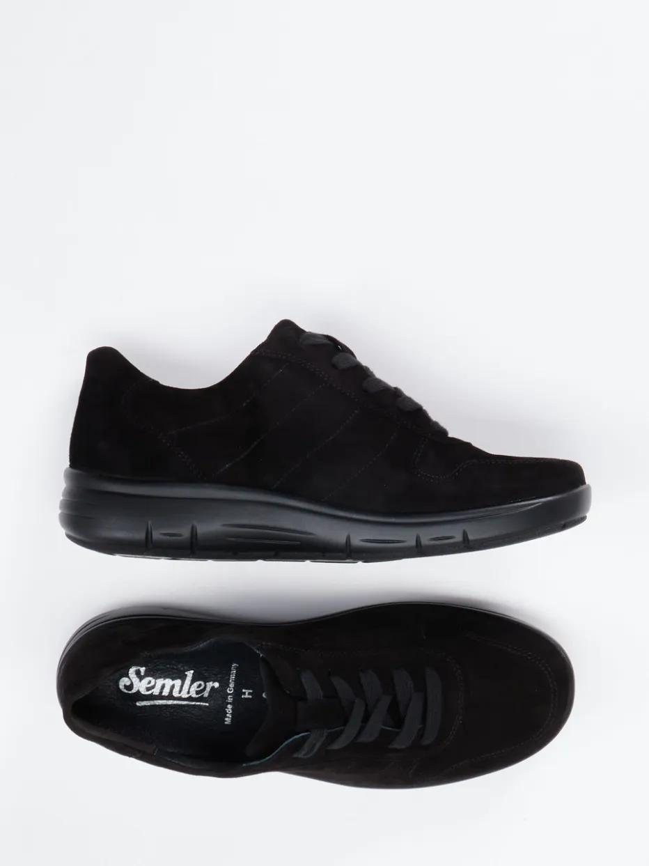 Schwarz, schlicht, komfortstark.Der Damen-Sneaker von Semler aus der Linie Greta überzeugt als vielseitiger Alltagsbegleiter. Dank seinem weichen Veloursleder in tiefem Schwarz mit matter Oberfläche bietet er ein angenehm anschmiegsames Tragegefühl. Ton-in-Ton-Steppnähte, klassisch gerundete Form und gepolsterter Einstieg sorgen für dezenten Stil und Komfort. Die PU-Luftpolstersohle mit Shock-Absorbing-System wirkt dämpfend und rutschhemmend zugleich. Ideal für ruhige Stilwelten wie „Quiet Luxury“ oder entspannte Casual-Looks. Durch das herausnehmbare Fußbett auch für eigene Einlagen geeignet. Semler kombiniert orthopädisch durchdachten Komfort mit subtiler Designästhetik.