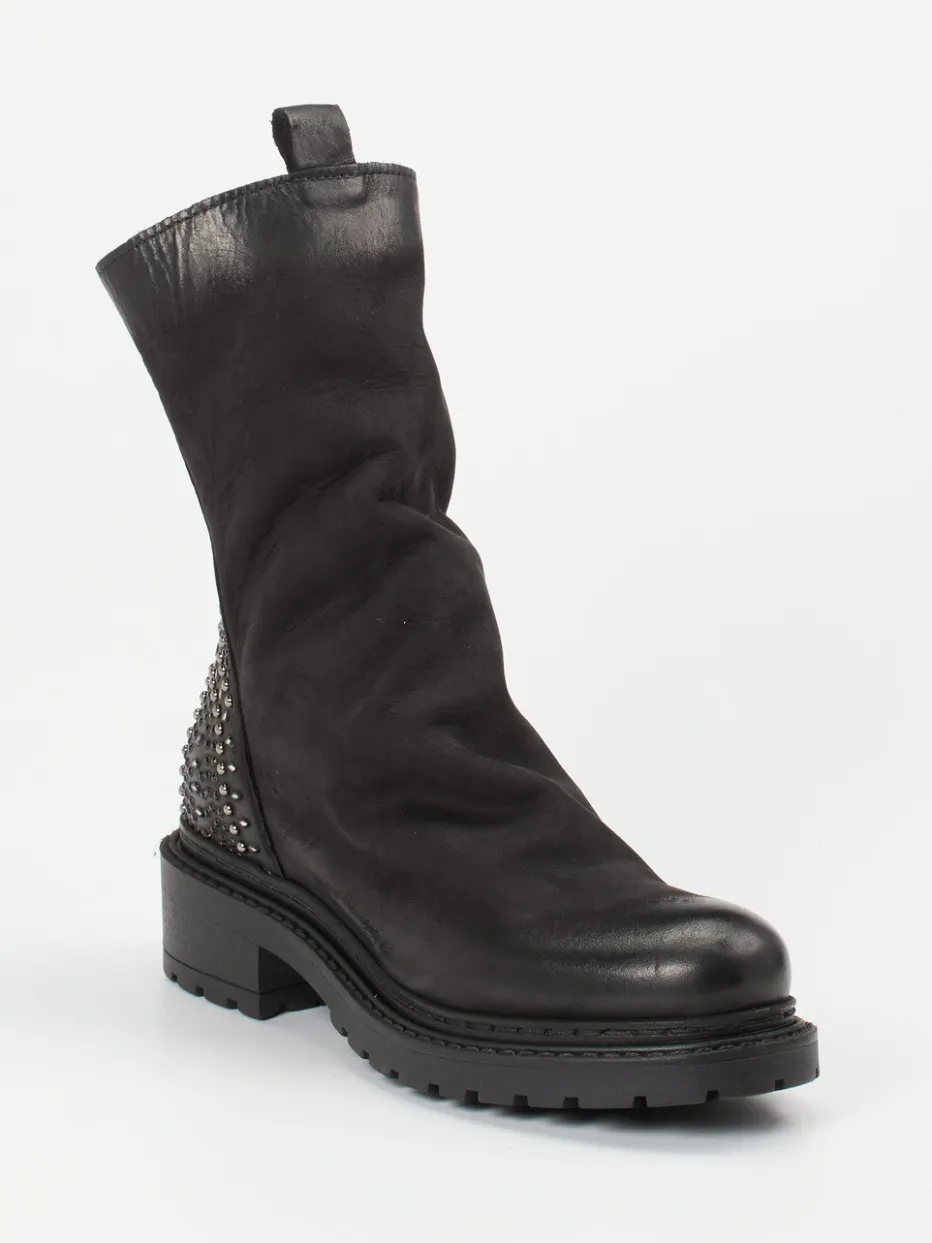 Stil trifft Stärke.Konstantin Starke interpretiert Biker-Stiefeletten mit urbaner Präzision. Für selbstbewusste Styles in Alltag oder Ausgehmomenten vereint dieses Modell tiefschwarzes Nubukleder – samtig angeschliffen am Schaft, mit glänzender Glattlederkappe – mit silberfarbenen Nieten am Fersenbereich. Der hintere Reißverschluss sorgt für Komfort, während die stark profilierte Gummisohle und der 3,5 cm hohe Absatz auf urbanes Terrain vorbereitet sind. Die gerade Silhouette, Zuglaschen und das ungefütterte Innenleben runden die saisonale Vielseitigkeit ab. Ein Hingucker im „Chunky Boots“-Trend mit Rock Chic-Flair. Markanter Komfort mit progressivem Stilverständnis – ein Highlight von Konstantin Starke.