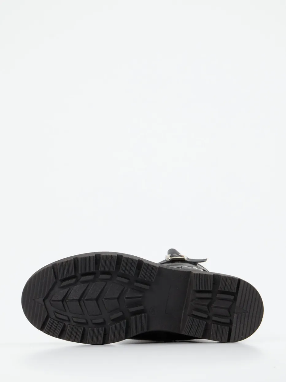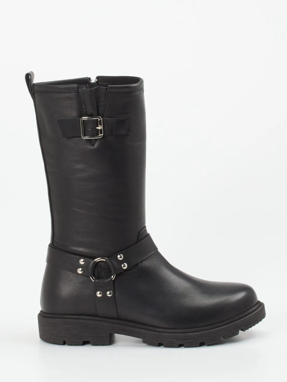 Diese Biker-Stiefelette kombiniert weiches Kalbleder mit markanter Hardware und robuster Sohle – ideal für urban inspirierte Looks mit Komfortanspruch.